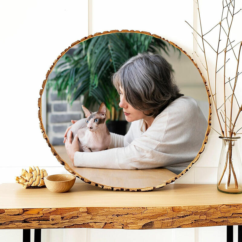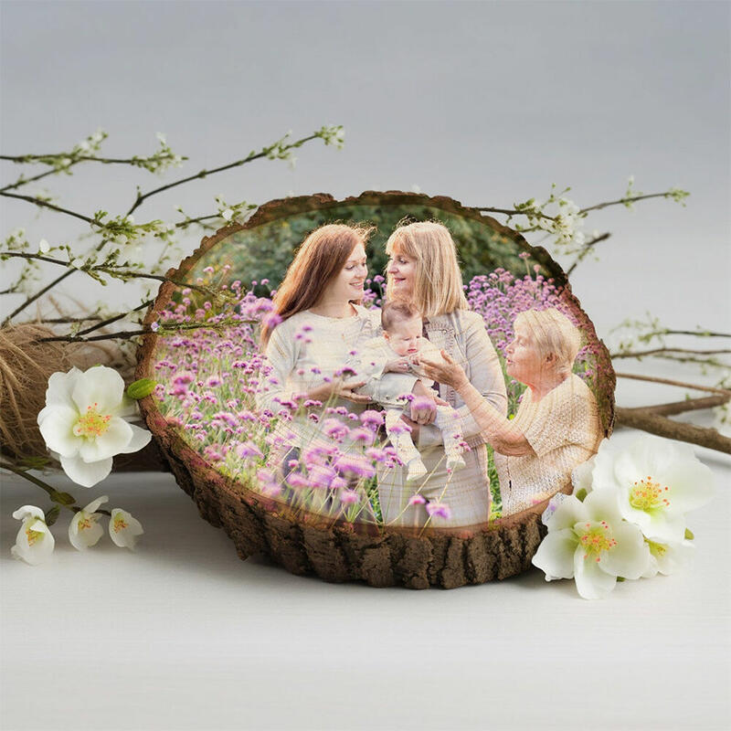 Photos will be cropped around the corners/edges, as this is the only way to fit a rectangular photo onto an oval piece of wood. All important aspects of the photo should not be located along the very edges of the picture.Colors of the photo on the wood may vary, as these are printed onto natural wood and not bright white paper.The bark of the wood is not removed.Our custom text engraving option allows you to add handwritten text to the back of the wood.