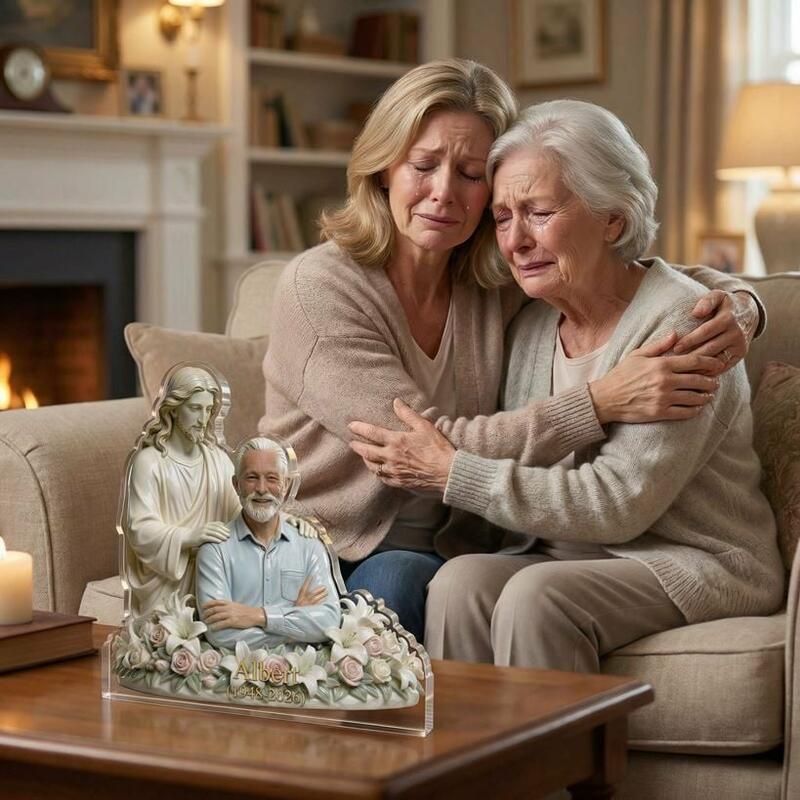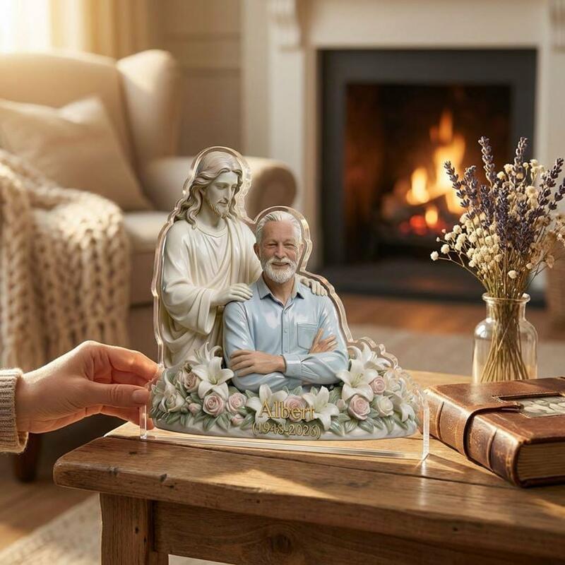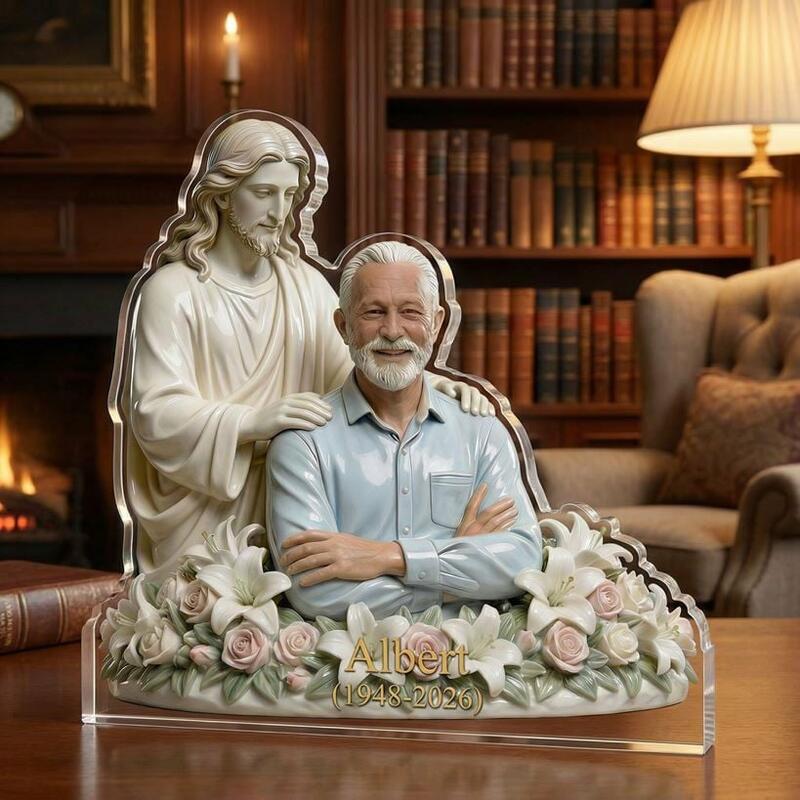This Custom Acrylic Memorial Plaque is a tender, faith-inspired tribute to honor the life and legacy of your beloved father, grandfather, or cherished family member who has passed away. Crafted from premium, crystal-clear acrylic, this keepsake features a serene, porcelain-style depiction of Jesus gently embracing your loved one—symbolizing divine comfort, protection, and the eternal bond of faith.