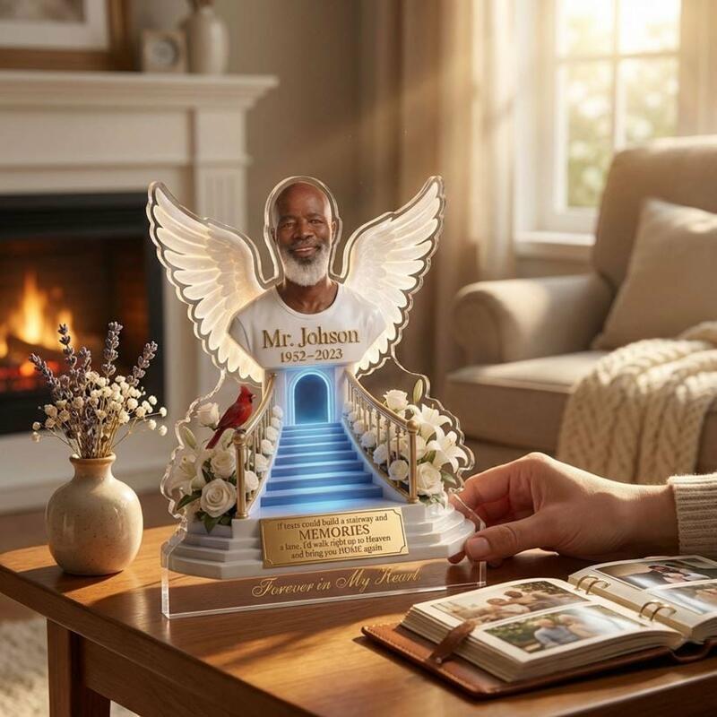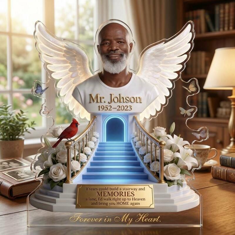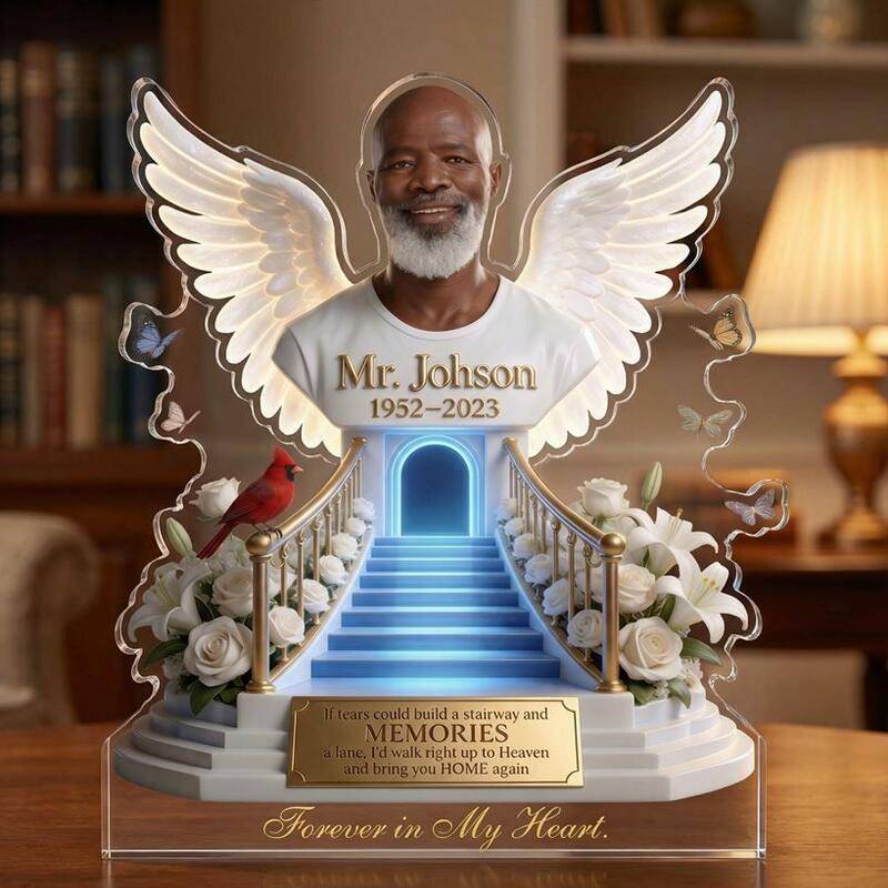This Custom Acrylic Memorial Plaque is a poignant, faith-filled tribute to honor the life and legacy of your beloved father, grandfather, or cherished family member who has passed away. Crafted from premium, crystal-clear acrylic, this keepsake features a powerful design: your loved one’s portrait framed by luminous angel wings, perched above a glowing stairway to heaven, surrounded by elegant white roses, lilies, and a vivid red cardinal—symbols of eternal love, hope, and the belief that departed loved ones are always near.