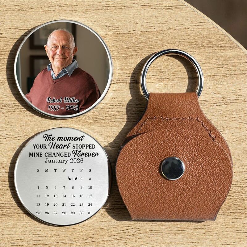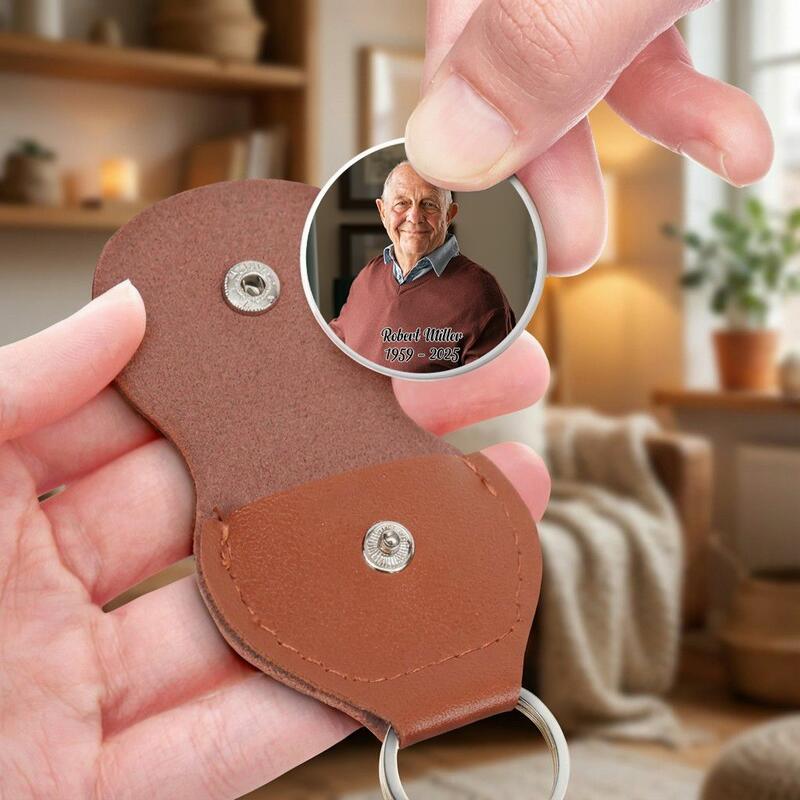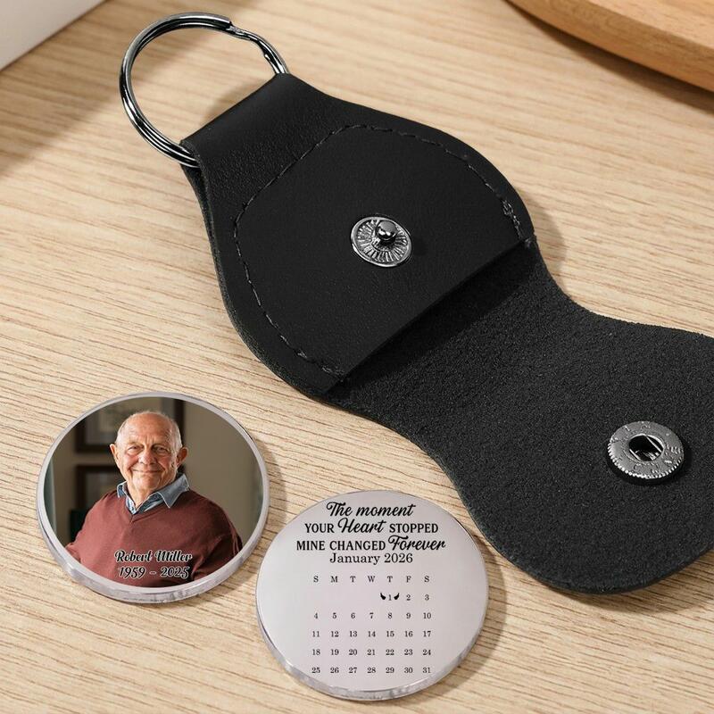 Custom Leather Pocket Hug Keychain with Photo Calendar Memorial Keepsake for Departed Loved Ones
