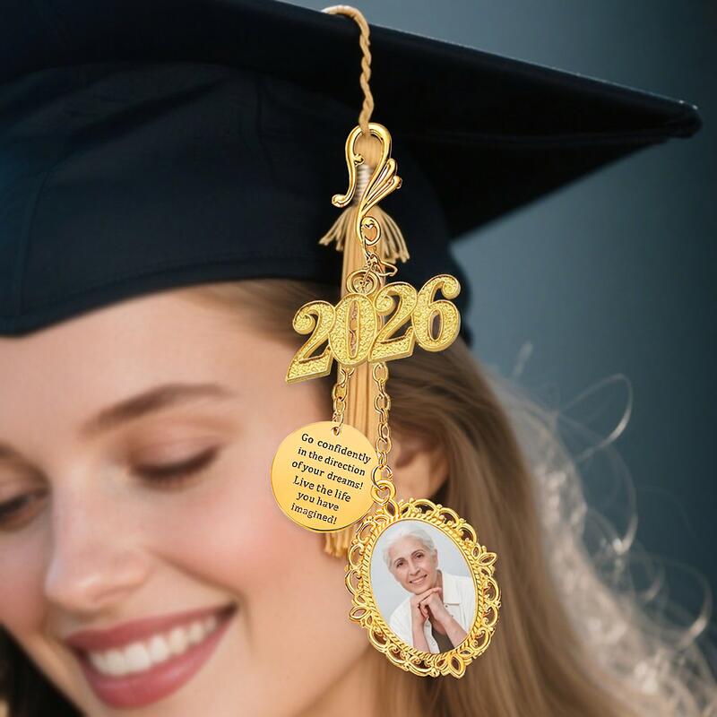 As your child prepares to walk across the stage to receive their diploma, honor this momentous achievement by gifting them this graduation tassel charm. Carefully crafted with attention to detail, this charm pays tribute to a loved one with a custom picture keepsake gift. Add a special touch by personalizing the gift with a photo, name, or a sweet message. A personalized tassel photo charm will be a heartwarming and practical gift for anyone during the upcoming graduation season. Not only is it a graduation cap charm with a picture and a short message, it's also a sweet reminder that your loved one isn't far away, but he or she is always with you in different ways.