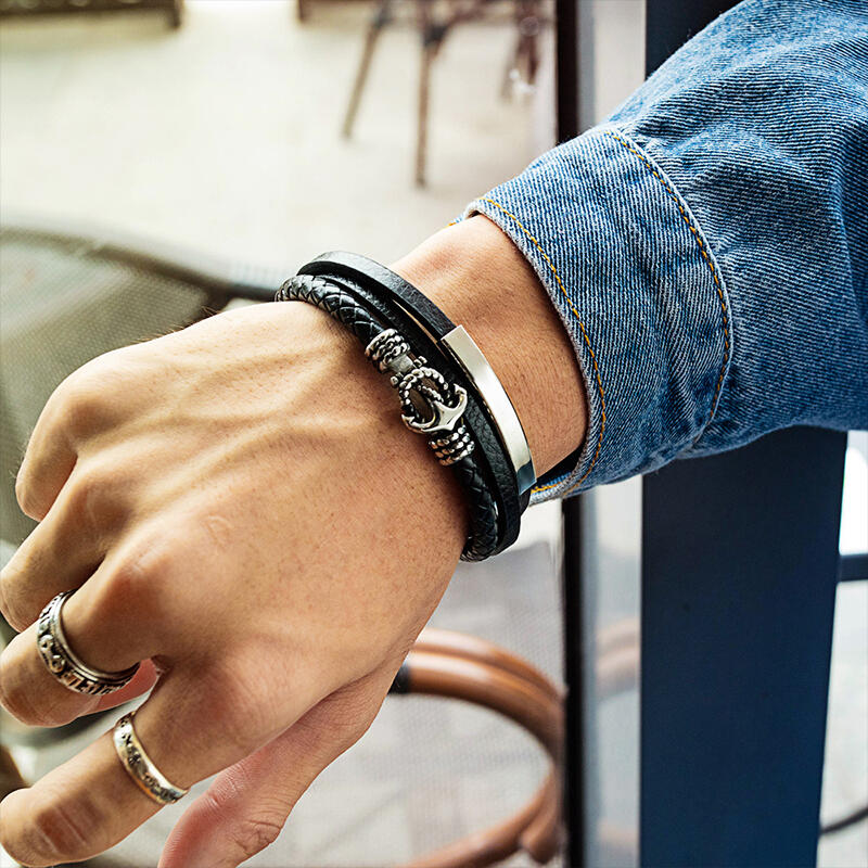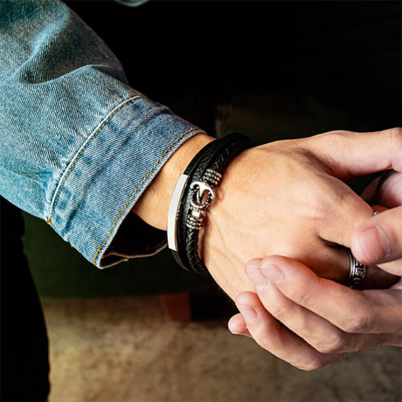 Men of all ages are sporting these stylish accessories. Wear your own anchor bracelet for men. Two rows of braided rope are connected by an exquisite anchor hook. This anchor bracelet for men has a seafaring appeal that adds elegance and sophistication to the piece, making it a great accent for both dressy and casual looks.