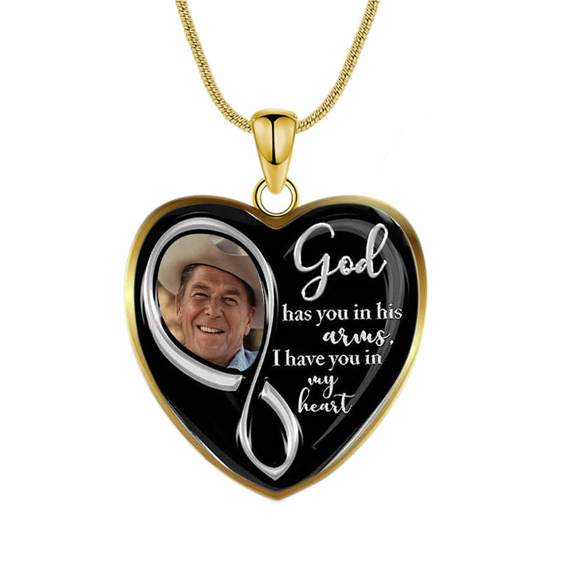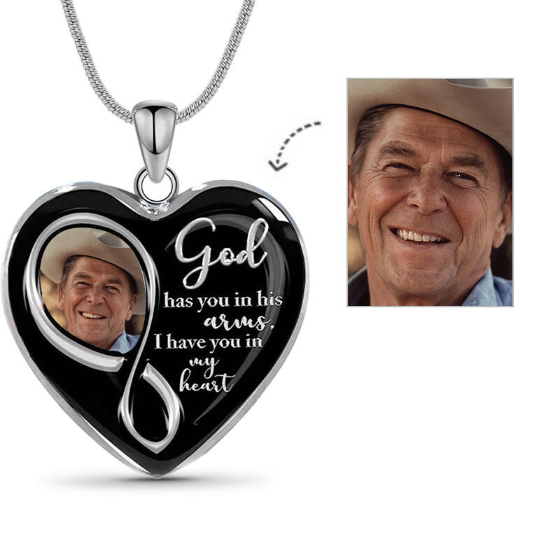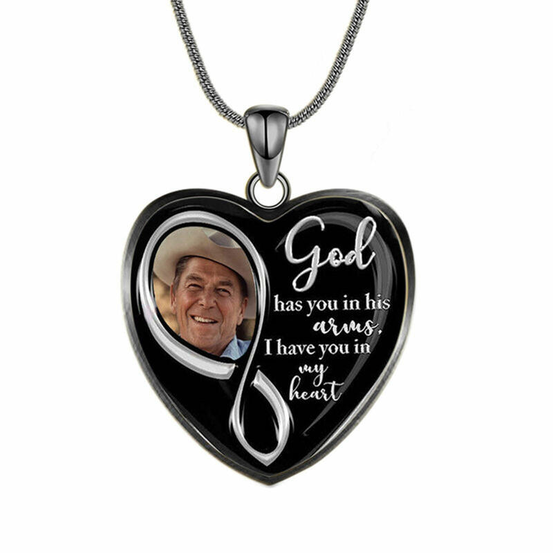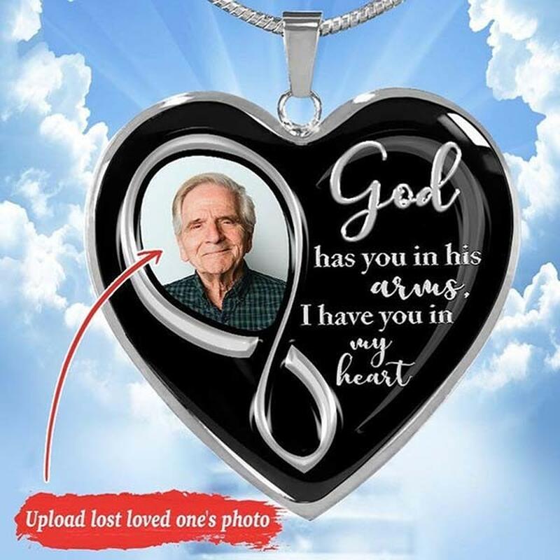 Have this beautiful piece of photo necklace "God Has You In His Arms, I Have You In My Heart " made to meet the needs of you or any loved ones. A memorial necklace is a great way to hold the memory of a loved one with you always. It's also a great comfort and conversation starter for when you just need to talk or be with someone. Nobody knows when that unfortunate day will take place that a loved one is taken from us. Let others know that you'll always remember the wonderful life they lived.