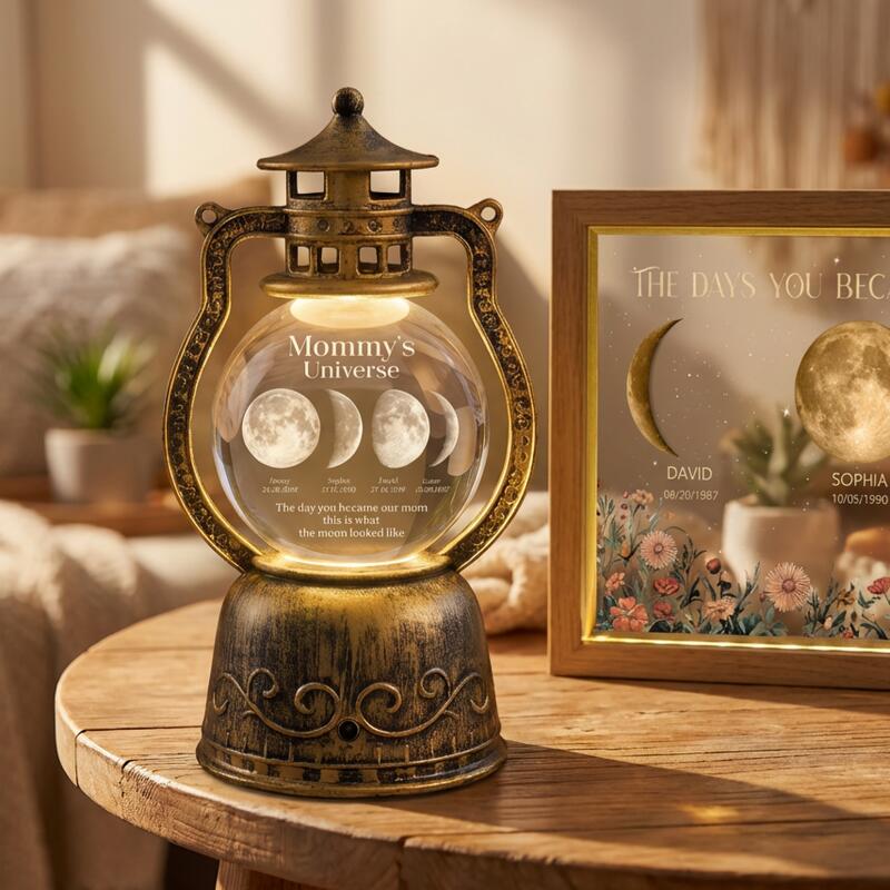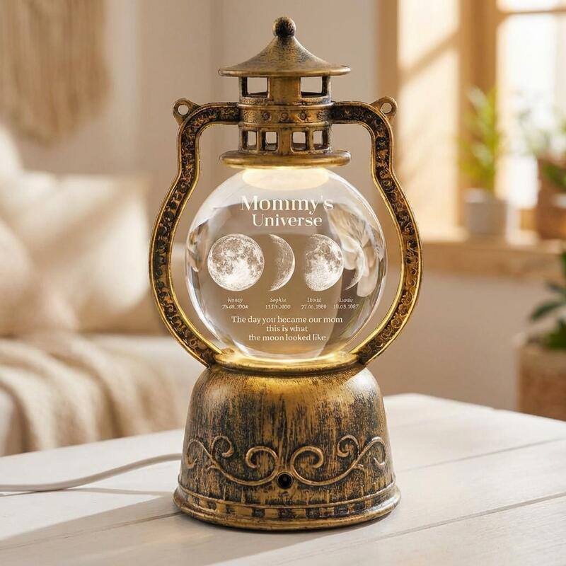 A mother’s heart is the center of her family’s gravity, holding every milestone and every soul in perfect orbit. This vintage-inspired lantern celebrates that celestial connection by capturing the exact moon phases from the nights her children were born, turning a simple lamp into a glowing map of her most sacred legacy.