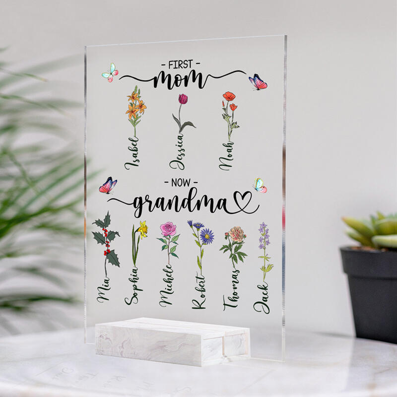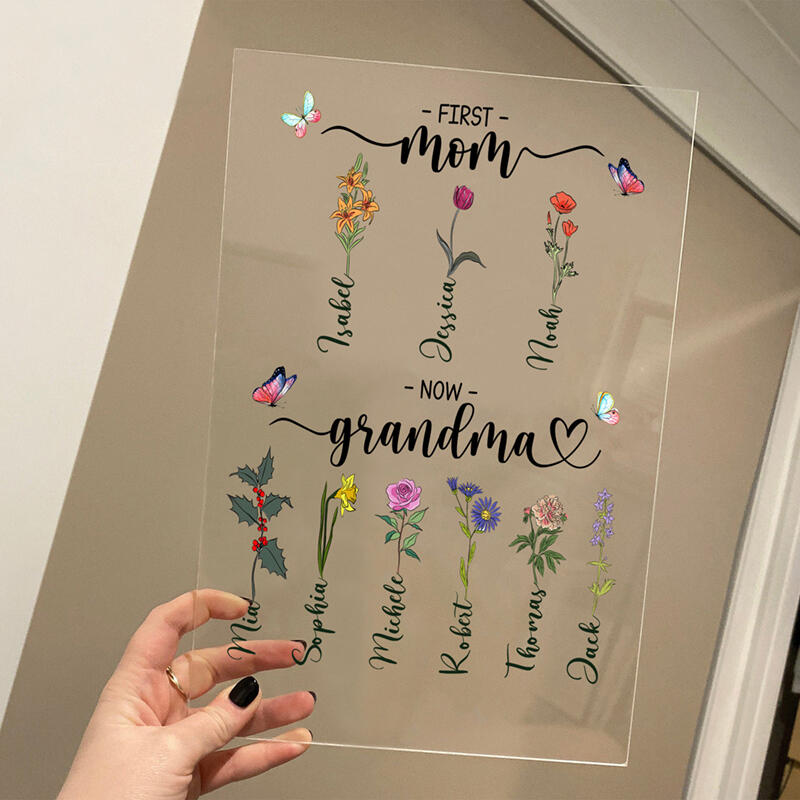 Personalized Acrylic Plaque First Mom Now Grandma Design Custom Birth Flowers Great Gift for Mother's Day