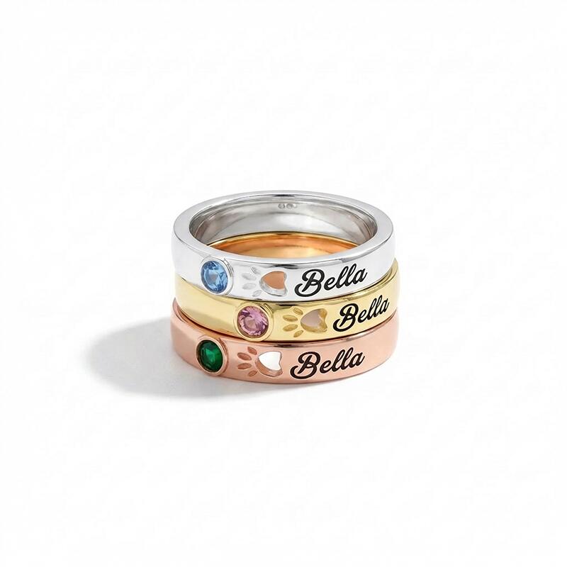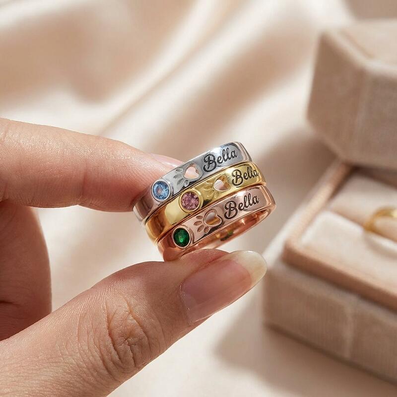 Personalized Birthstone Ring with Pet Paw Print Design Cute Gift for Pet Lovers