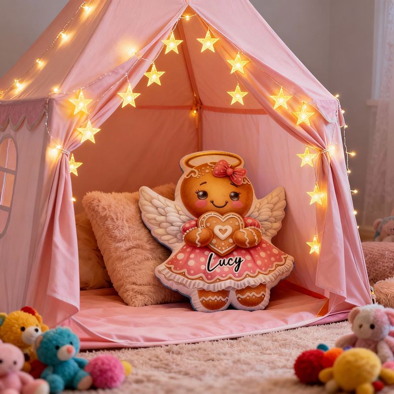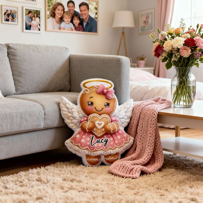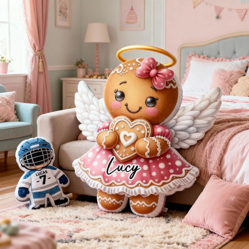 Personalized Cartoon-Shaped Pillow Angel Gingerbread Girl in Pink Dress Gift for Her Kids