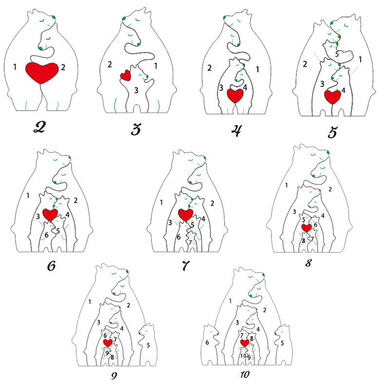 Each of our wooden puzzles is made from high-quality wood and is carefully designed and crafted. We pay attention to every detail to ensure each puzzle is of high quality and durability. One of the features of our wooden puzzles is the ability to customize them with family members' names. You can tell us the names of family members and we will use them to engrave the corresponding places on each puzzle piece. In this way, when you put the puzzle together, each family member's name will appear on the puzzle, showing the warmth of the family and making everyone feel belonging and cared for. We have designed a variety of animal shapes, such as bears, rabbits, kittens, etc. Each animal is carefully carved and painted, lifelike, full of childlike fun and cuteness. These animal-shaped puzzles will bring you a pleasant puzzle experience, while also adding to the decorative nature of the product, making it a beautiful addition to your home.
