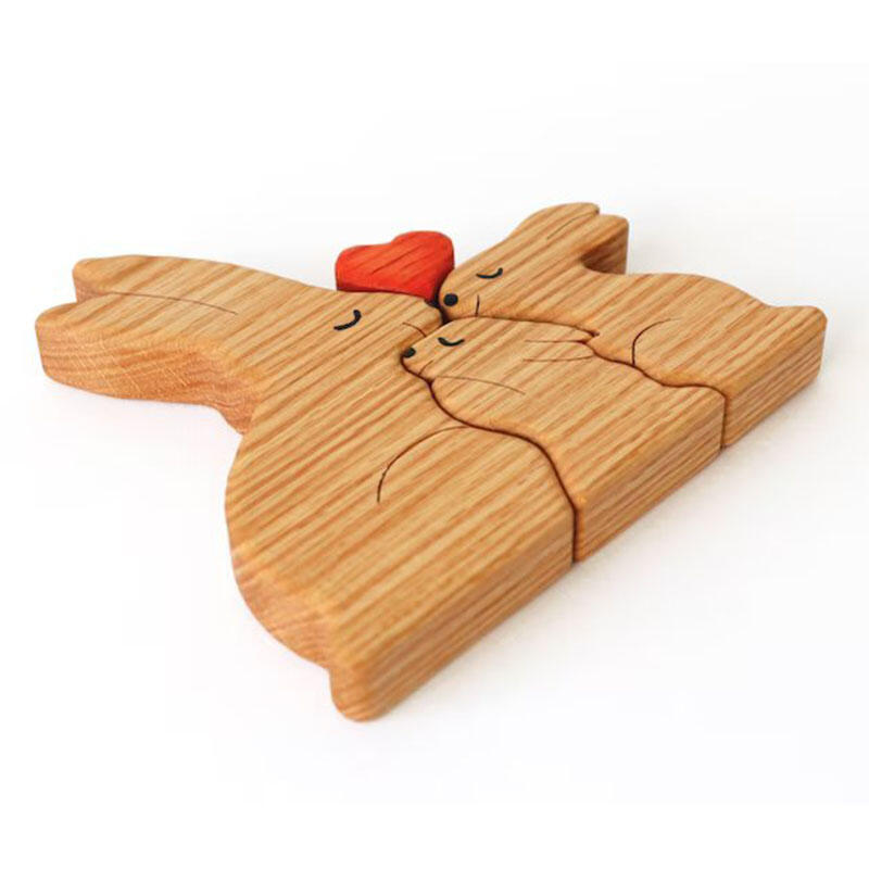 Each of our wooden puzzles is made from high-quality wood and is carefully designed and crafted. We pay attention to every detail to ensure each puzzle is of high quality and durability. One of the features of our wooden puzzles is the ability to customize them with family members' names. You can tell us the names of family members and we will use them to engrave the corresponding places on each puzzle piece. In this way, when you put the puzzle together, each family member's name will appear on the puzzle, showing the warmth of the family and making everyone feel belonging and cared for. We have designed a variety of animal shapes, such as bears, rabbits, kittens, etc. Each animal is carefully carved and painted, lifelike, full of childlike fun and cuteness. These animal-shaped puzzles will bring you a pleasant puzzle experience, while also adding to the decorative nature of the product, making it a beautiful addition to your home.