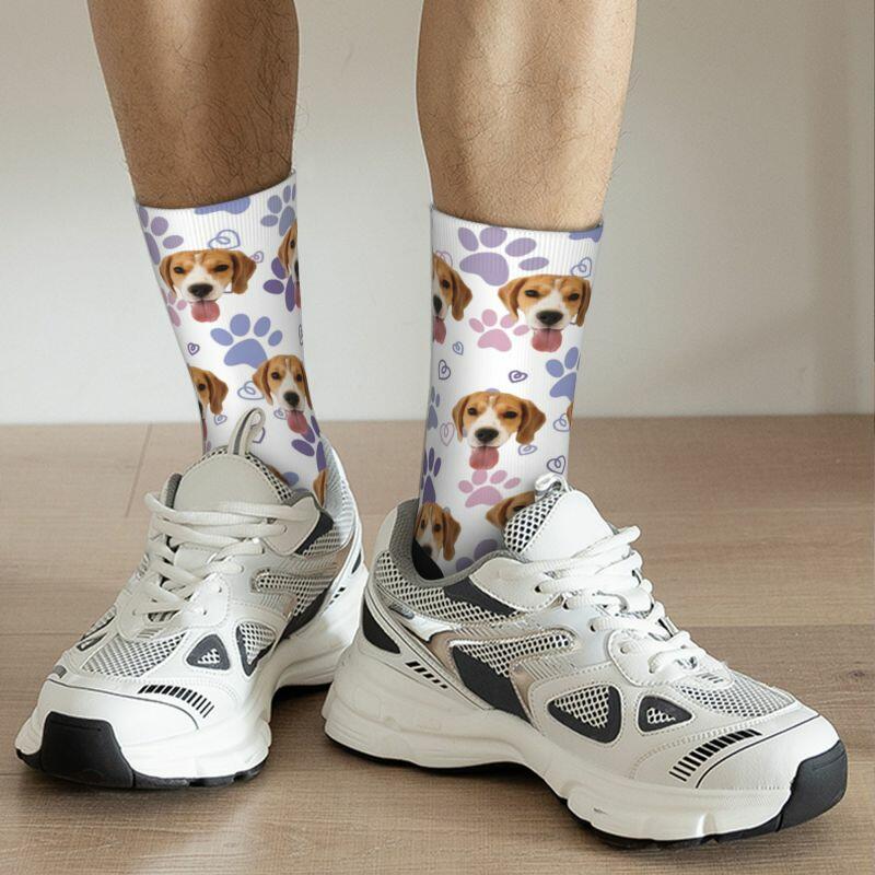 These socks are designed with a variety of pet-related elements, from paw prints to playful illustrations, creating a whimsical and charming look. Each pair of socks can be customized with a photo of your beloved pet, making them a truly personalized and heartwarming accessory.These products are designed to celebrate the love and joy our furry friends bring to our lives.