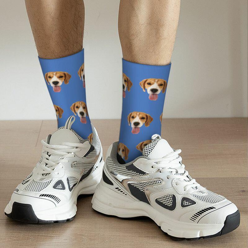 These socks are designed with a variety of pet-related elements, from paw prints to playful illustrations, creating a whimsical and charming look. Each pair of socks can be customized with a photo of your beloved pet, making them a truly personalized and heartwarming accessory.These products are designed to celebrate the love and joy our furry friends bring to our lives.
