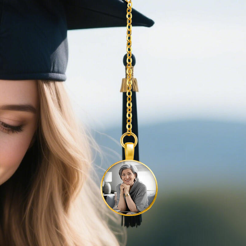 As your child prepares to walk across the stage to receive their diploma, honor this momentous achievement by gifting them this graduation tassel charm. Carefully crafted with attention to detail, this charm pays tribute to a loved one with a custom picture keepsake gift. Add a special touch by personalizing the gift with a photo, name, or a sweet message. A personalized tassel photo charm will be a heartwarming and practical gift for anyone during the upcoming graduation season. Not only is it a graduation cap charm with a picture and a short message, it's also a sweet reminder that your loved one isn't far away, but he or she is always with you in different ways.