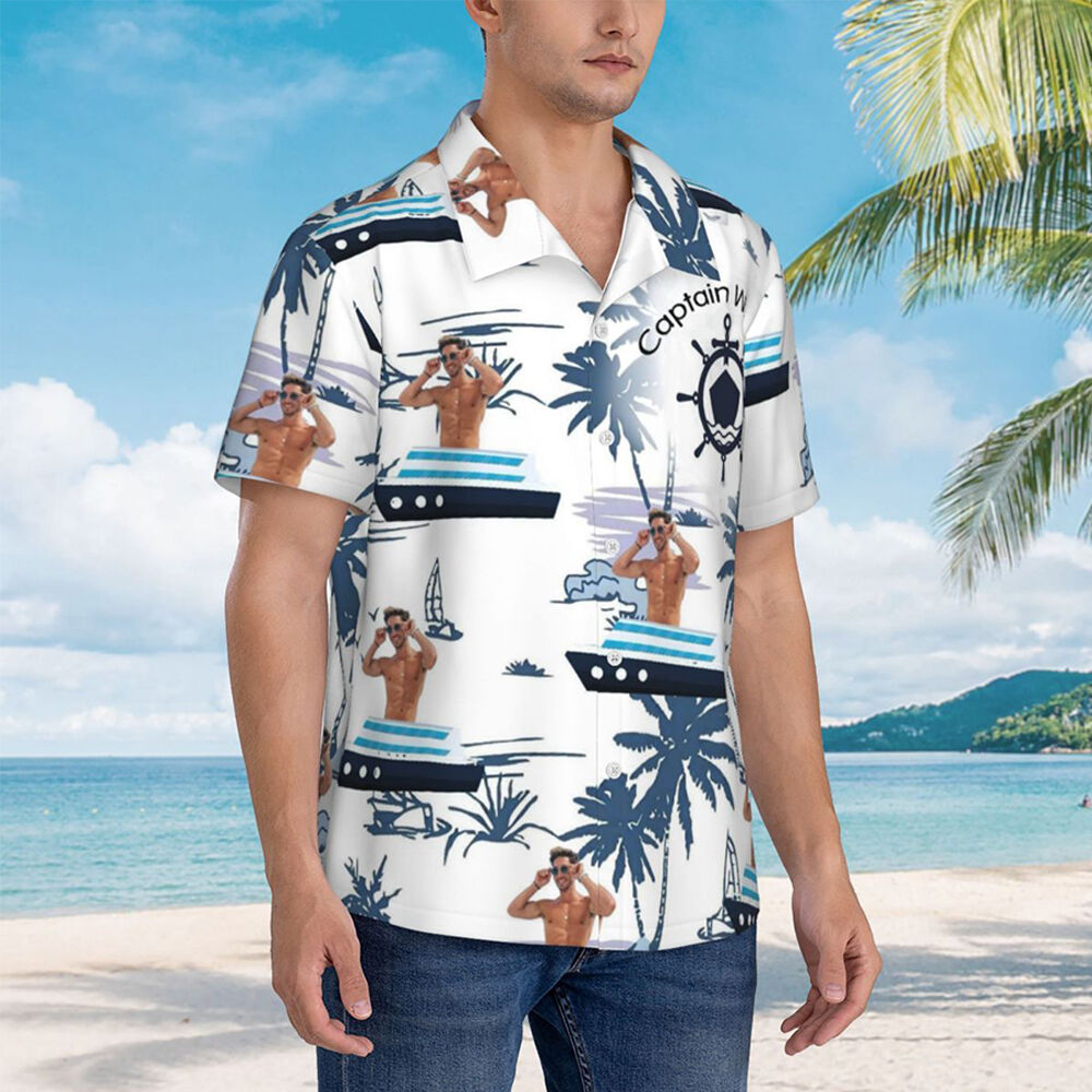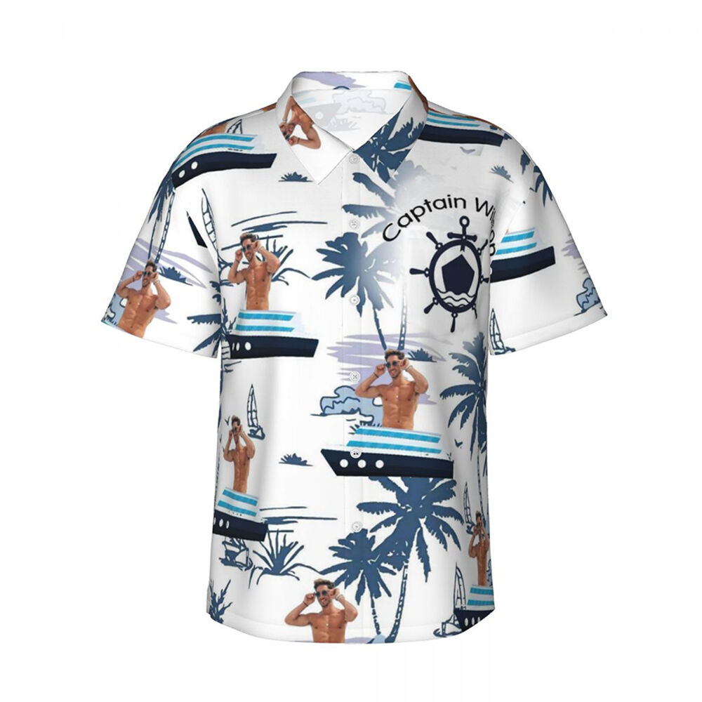 Personalized Hawaiian Shirt with Boat Print Funny Captain Title Short Sleeve Shirt Gift for Men