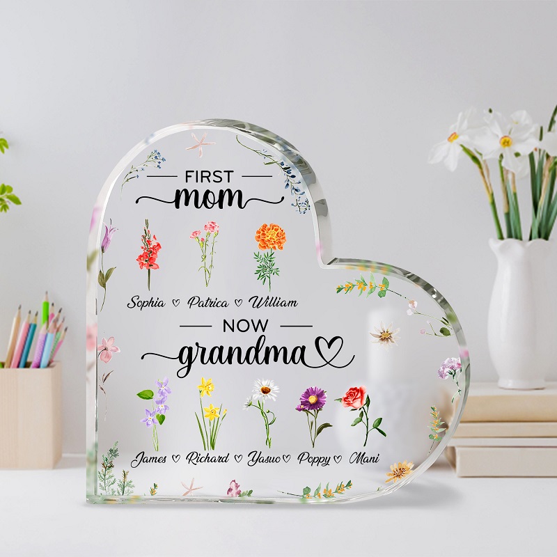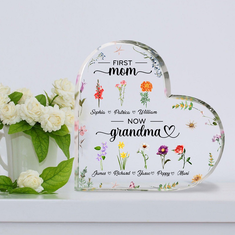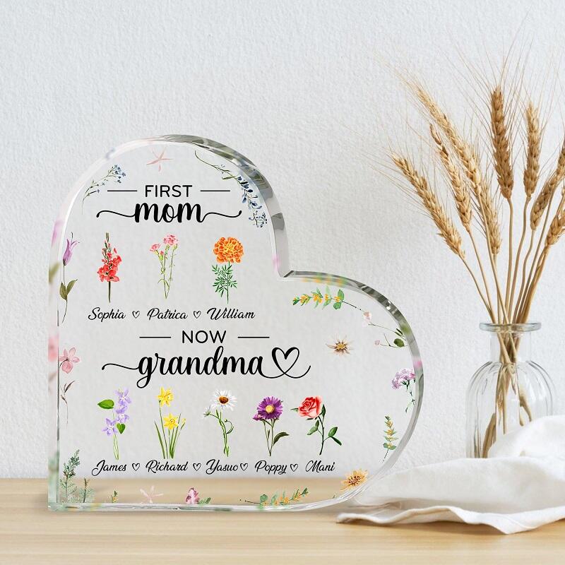 Personalized Heart Shaped Acrylic Plaque Custom Birth Flowers First Mom Now Grandma Design Unique Gift for Mother's Day