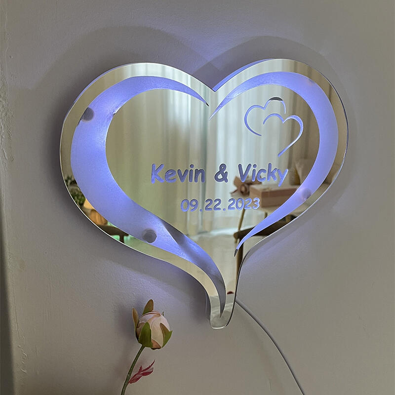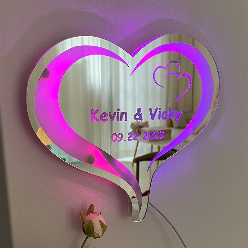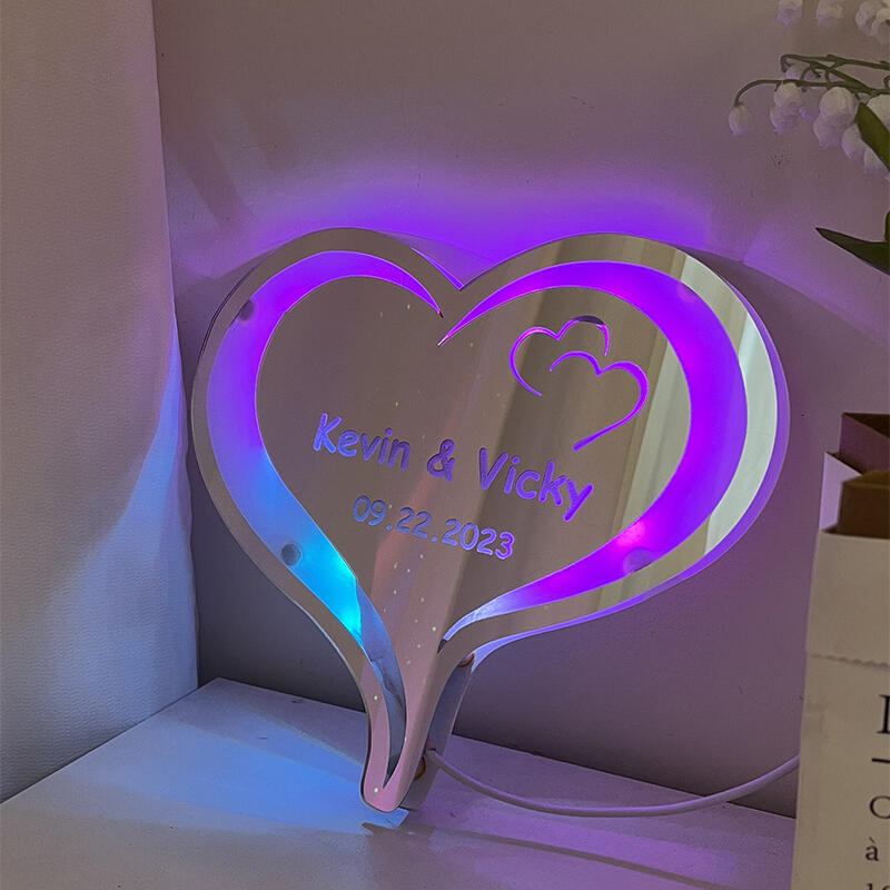 Personalized Heart-Shaped Mirror Lamp With Custom Couple Names For Valentine's Day