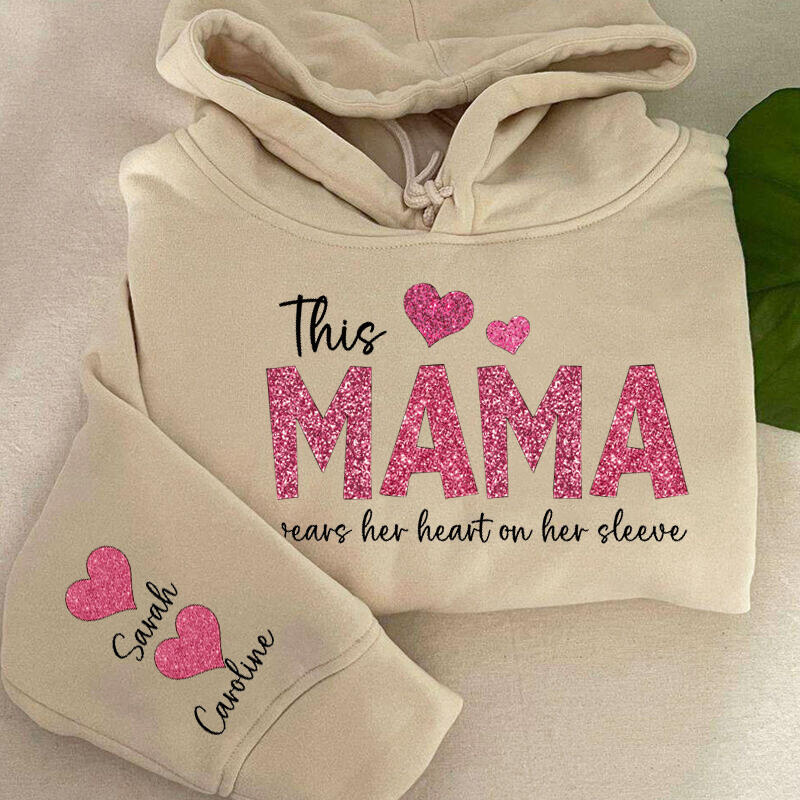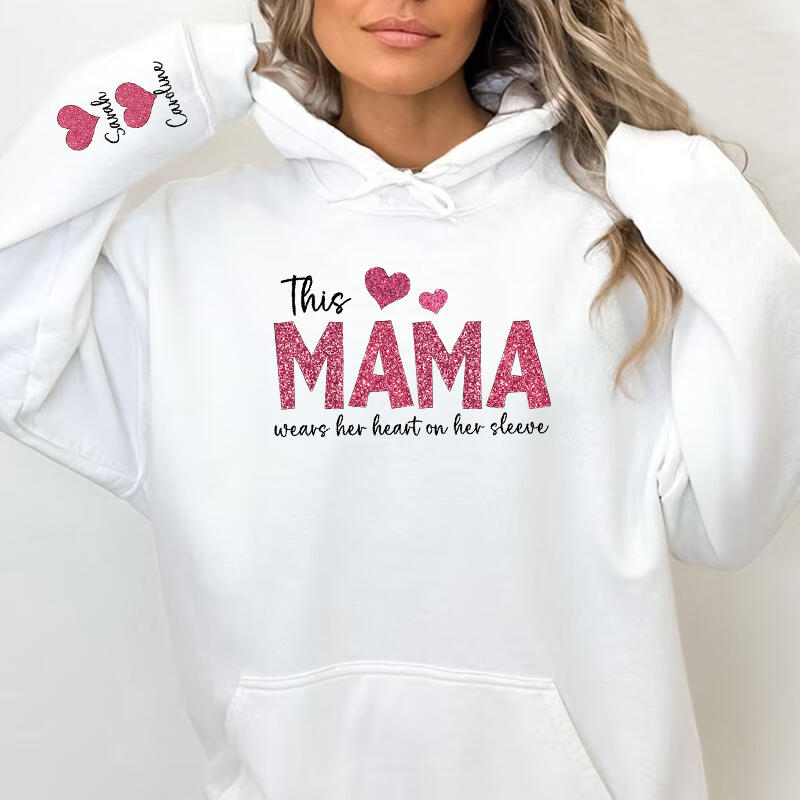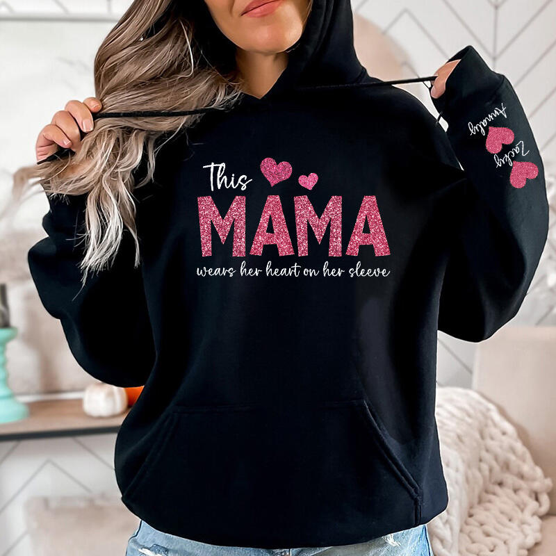 Personalized Hoodie This Mama Wears Her Heart On Her Sleeve Custom Glitter Design Exquisite Mother's Day Gift
