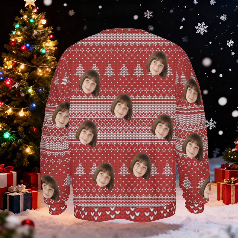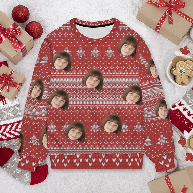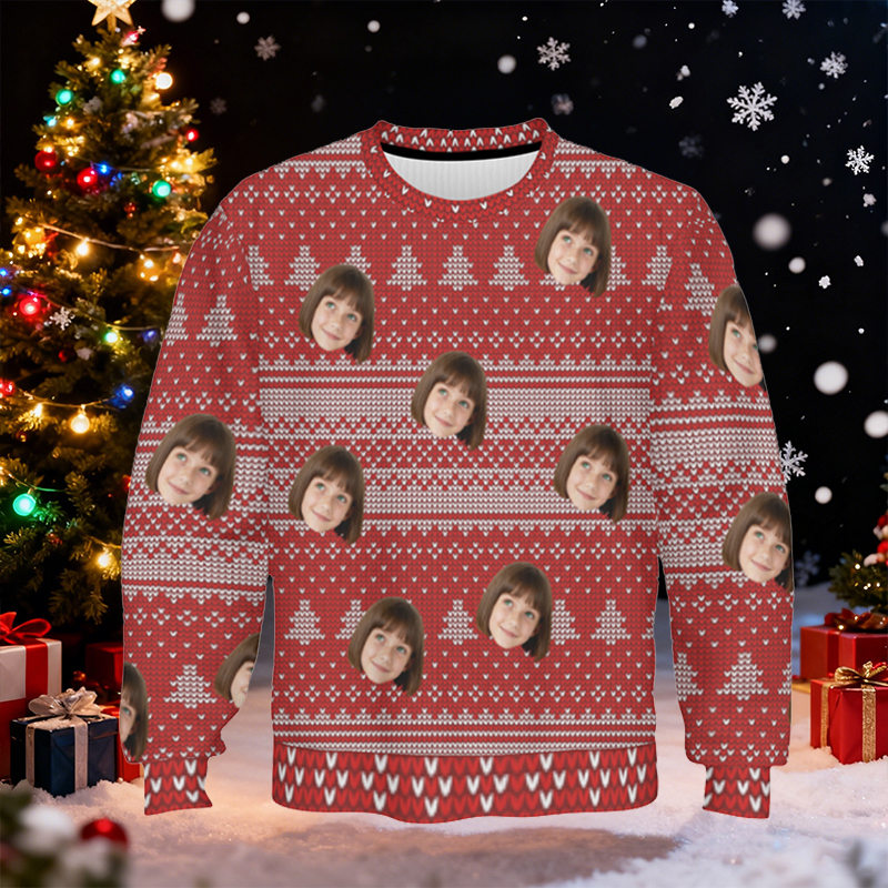 Personalized Kids Ugly Sweater Unisex Custom Face Photo Red Festival Style Design Gift for Christmas