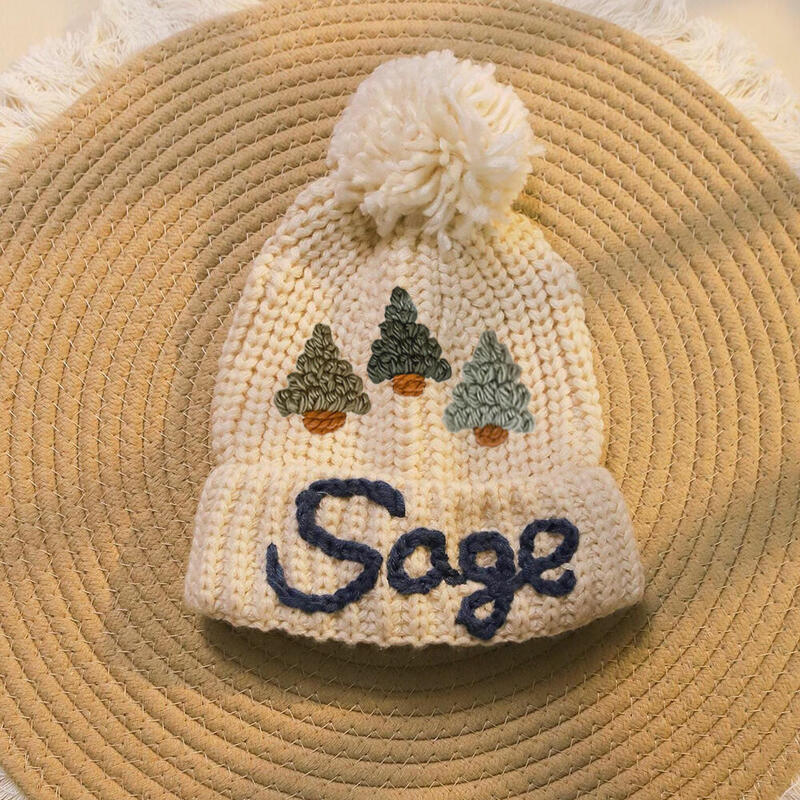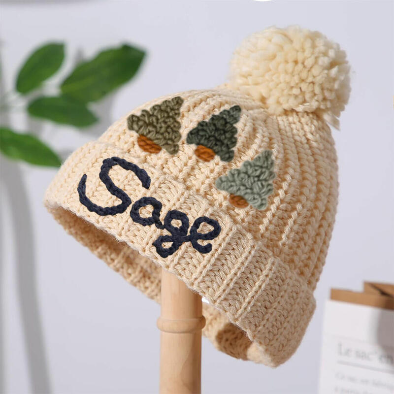 Personalized Knit Pom Pom Beanie with Christmas Tree Custom Embroidered Name for Baby
