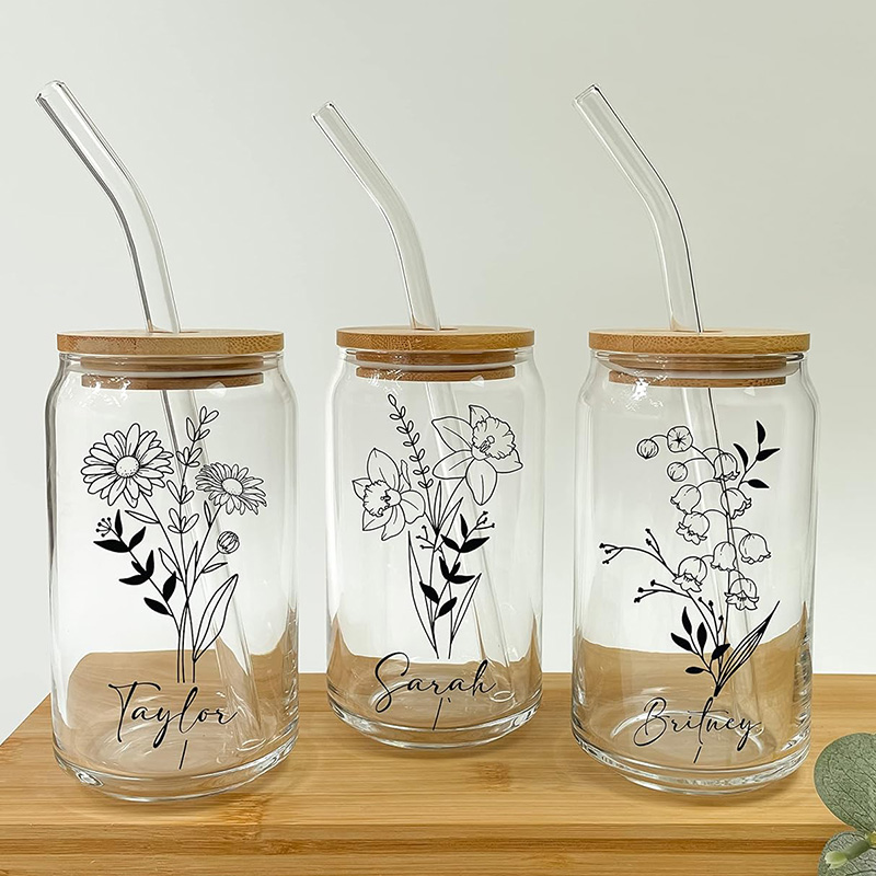 Personalized Name And Birth Flower Glass Cup with Lid And Straw Cool Gift for Kids