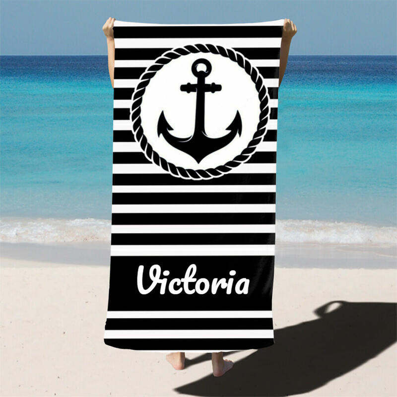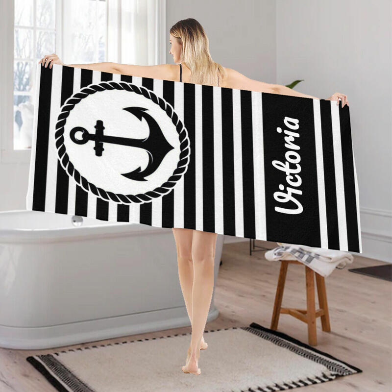 Personalized Name Beach Bath Towel with Black Anchor Pattern Funny Gift for Best Person