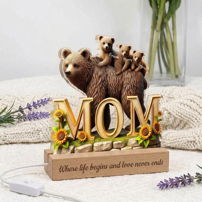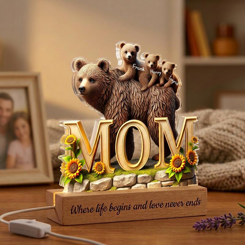 This design features a strong bear carrying three cubs, each personalized with names, making it a touching symbol of protection and care. Beneath the bear, the golden letters spelling “MOM” are adorned with sunflowers, while the engraved phrase on the wooden base, “Where life begins, and love never ends,” completes the heartfelt tribute.