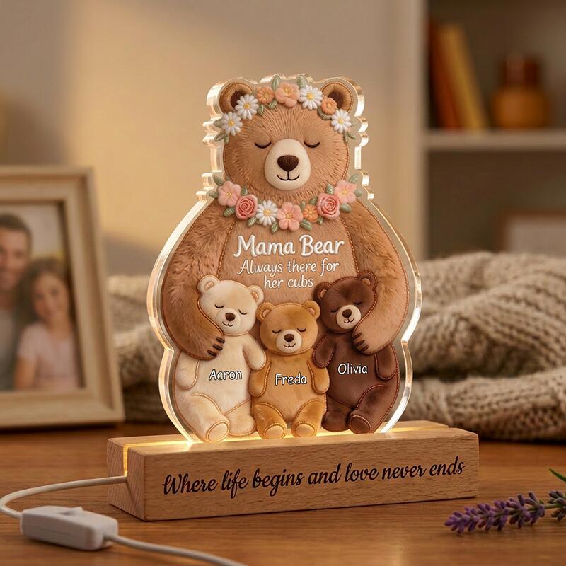 Personalized Mama Bear & Cubs Night Light – A Custom Glowing Tribute to a Mother’s Unwavering Love