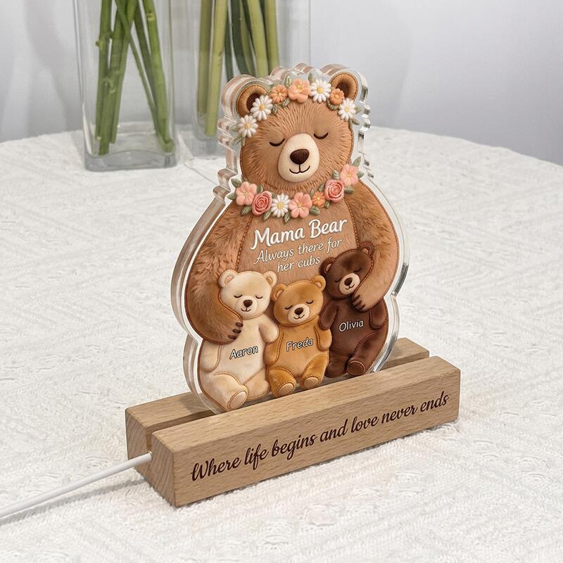 This personalized night light is a tender, heartfelt keepsake crafted to honor the mama bear who always stands by her cubs, glowing with the custom names of the little ones she loves most.