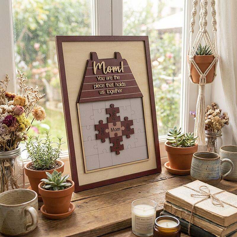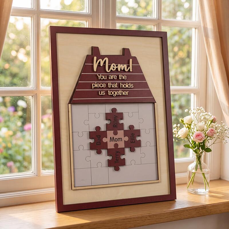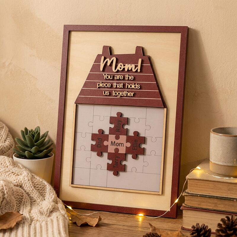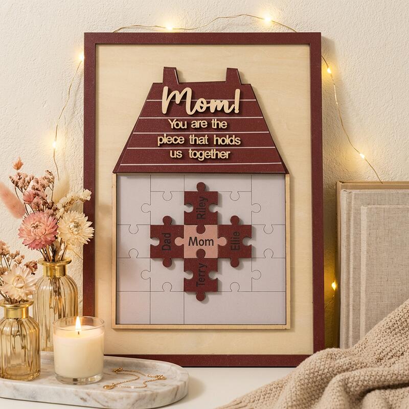 Designed as a warm, cozy house motif, this custom piece features a puzzle where mom sits at the heart, surrounded by puzzle pieces engraved with the names of her children, partner, or any loved ones. The sweet, heartfelt message “Mom! You are the piece that holds us together” sits atop the house roof, a permanent reminder of her irreplaceable role as the glue of your family. The soft, neutral background and rich, warm tones make it a timeless addition to any home decor, turning a simple wall or shelf into a daily celebration of her love.