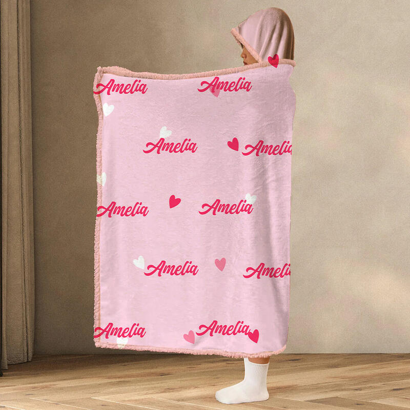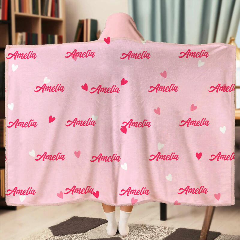 Personalized Name Wearable Blanket Hoodie with Heart Pattern Sweet Gift for Girl Friend