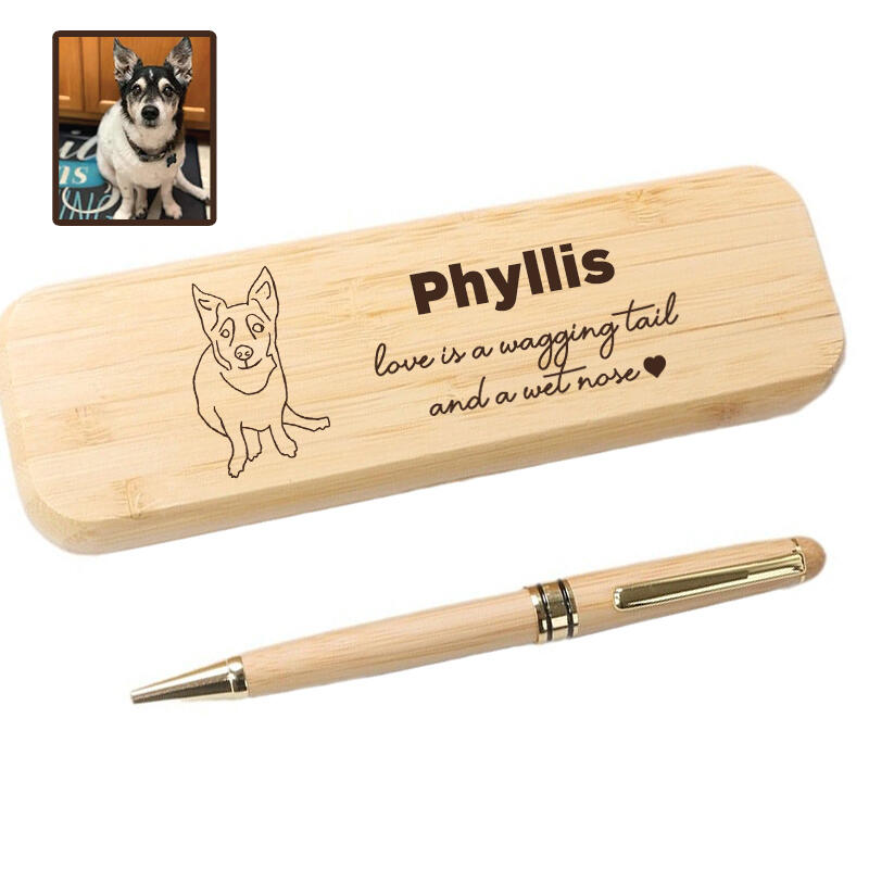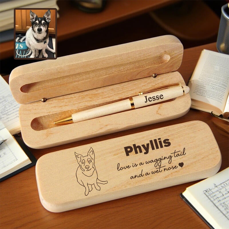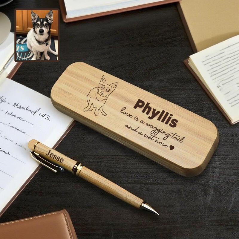 Personalized Pen Wooden Box Custom Message Pet Photo Line Drawing Design Perfect Gift for Pet Lovers