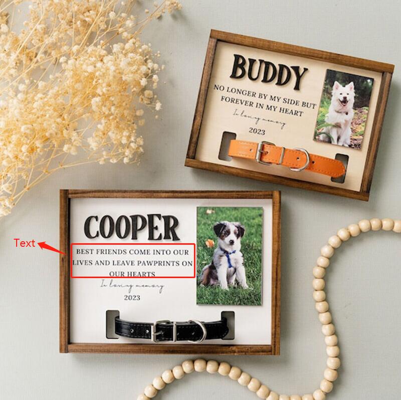 What makes this pet collar photo frame unique is its ability to be customized. You can choose your pet's most treasured photos and customize them in frames to remember your pet's cuteness. At the same time, you can also add your pet's name to make this photo frame more personal and memorable. In addition, you can also add some warm words to the photo frame to express your deep memory and gratitude for your pet, and finally send the pet collar to the photo frame (you need to bring your own collar). This photo frame is not only a memorial to your pet A great choice and a special gift. Whether it's a keepsake for yourself or a gift for a pet lover, this frame conveys the deep affection you have for your pet. It will help you preserve the beautiful memories of your pet forever, allowing you to miss your pet's companionship and care all the time.