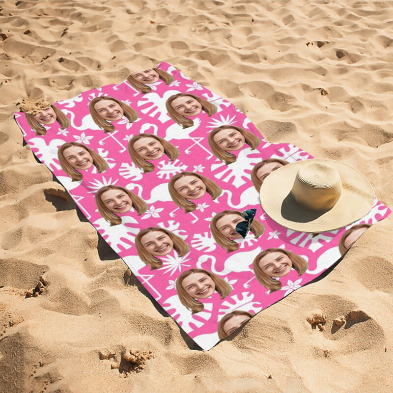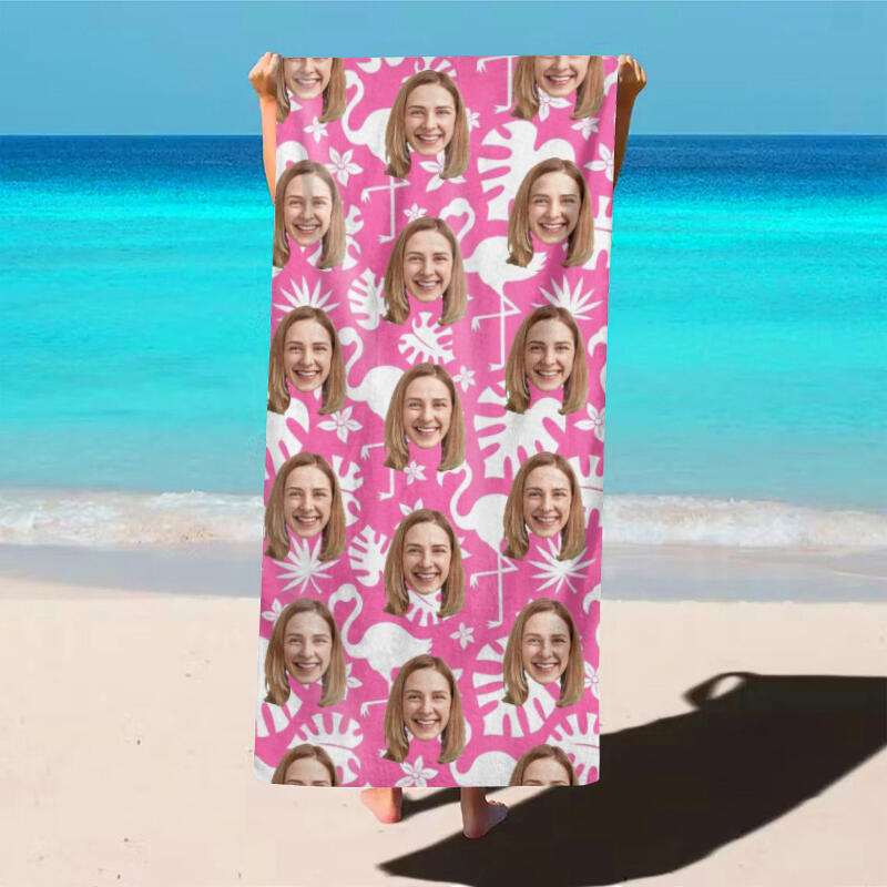 Personalized Photo Bath Towel with Flamingo Pattern Beautiful Gift for Bestie