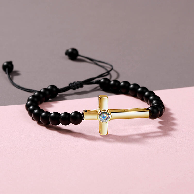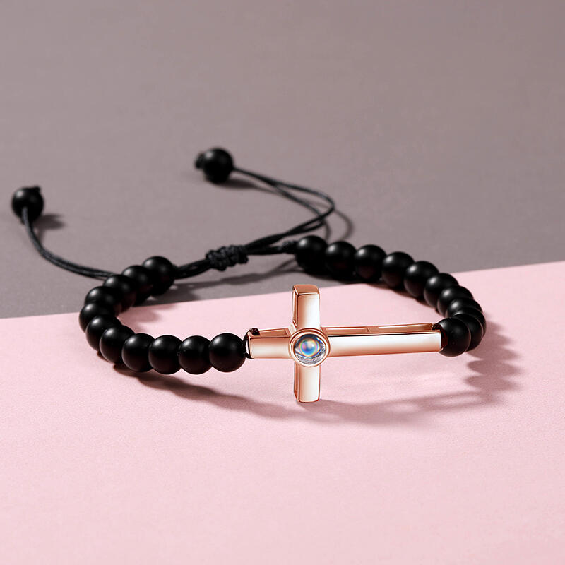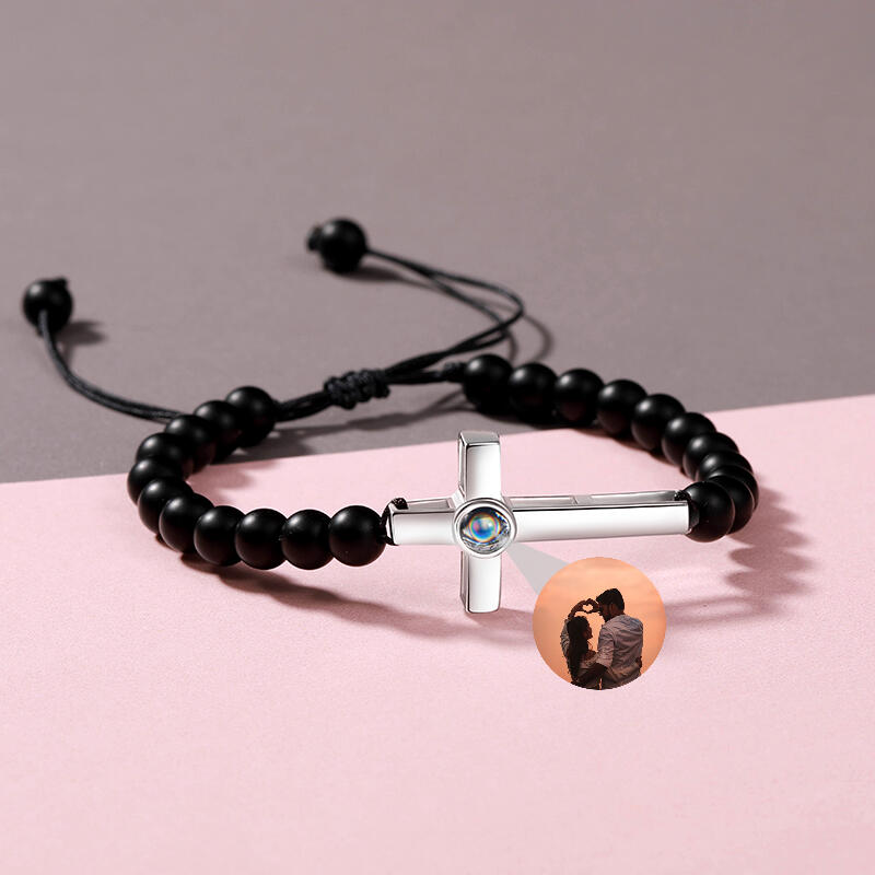 Personalized Photo Black Beaded Projection Bracelet with Cross for Boyfriend