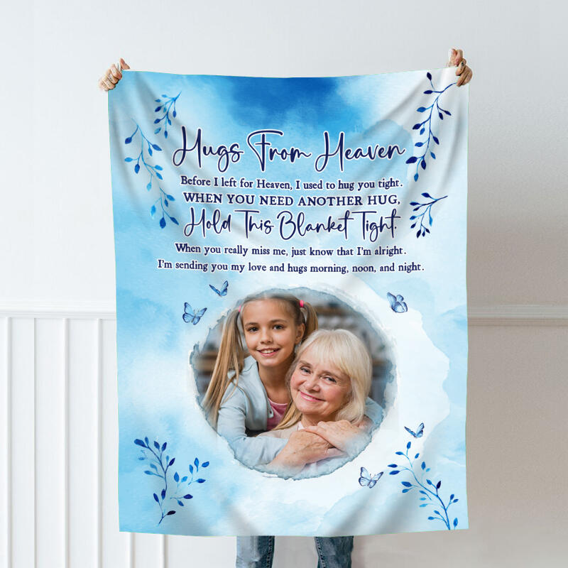 Personalized Picture Blanket with Blue Leaves Pattern Memorial Gift for Family