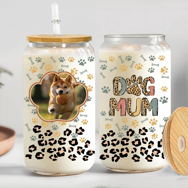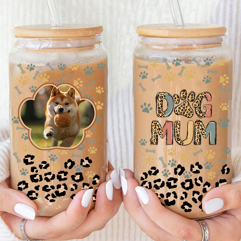 Personalized Picture Glass Cup with Lid And Straw Best Present for Dog Mum