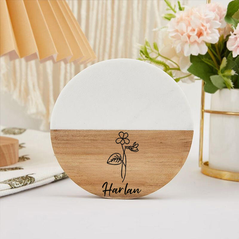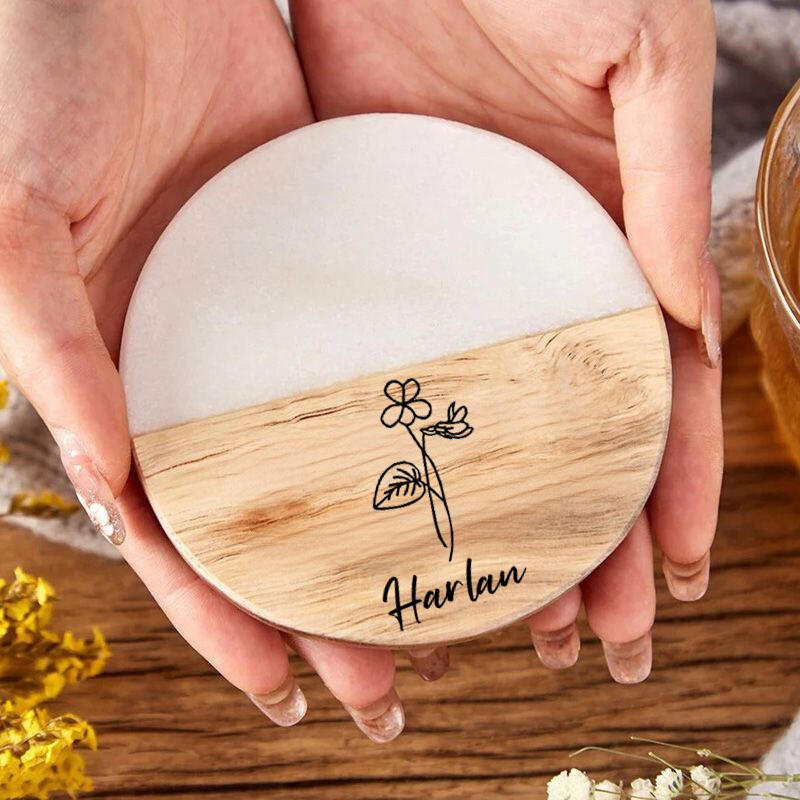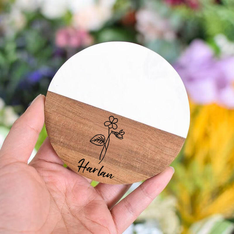 Personalized Round Coaster with Custom Birth Flower Marble Splicing Design Great Gift for Her