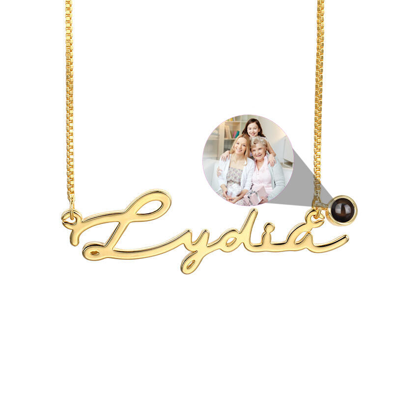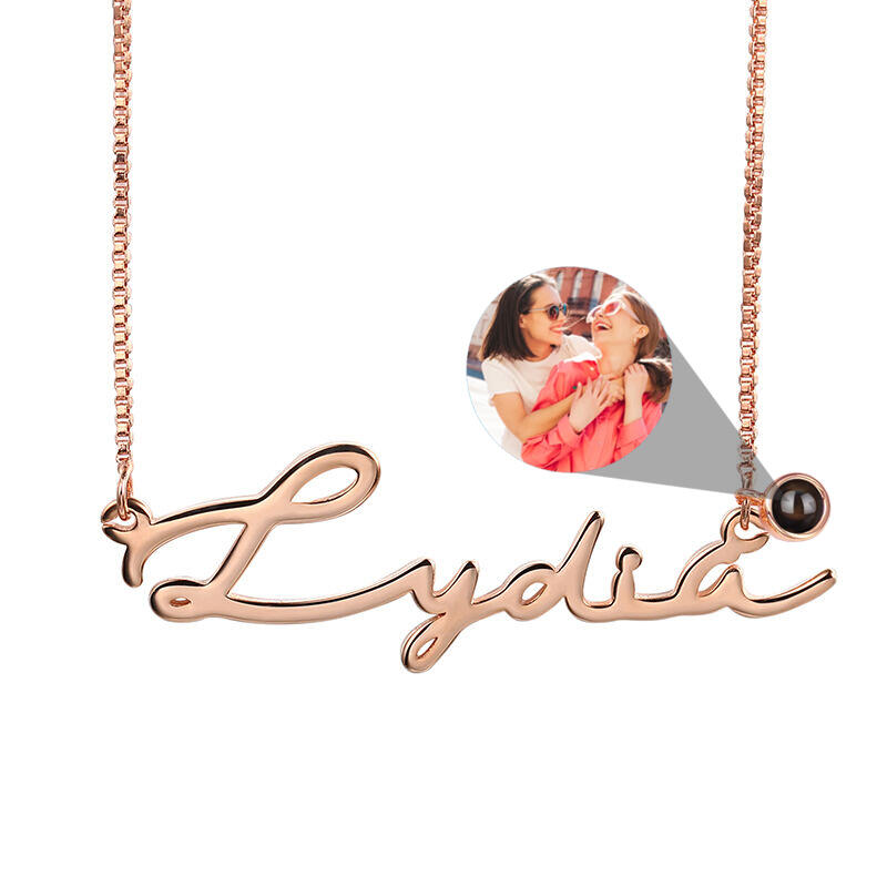 This personalized signature style name and picture projection necklace is the perfect gift for any occasion! A charming piece that's perfect for customizing with a name, nickname,a picture,or inspiring word,this name necklace looks amazing on its own or layered with other necklaces to create trendy appeal.