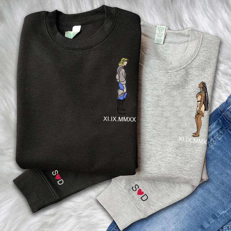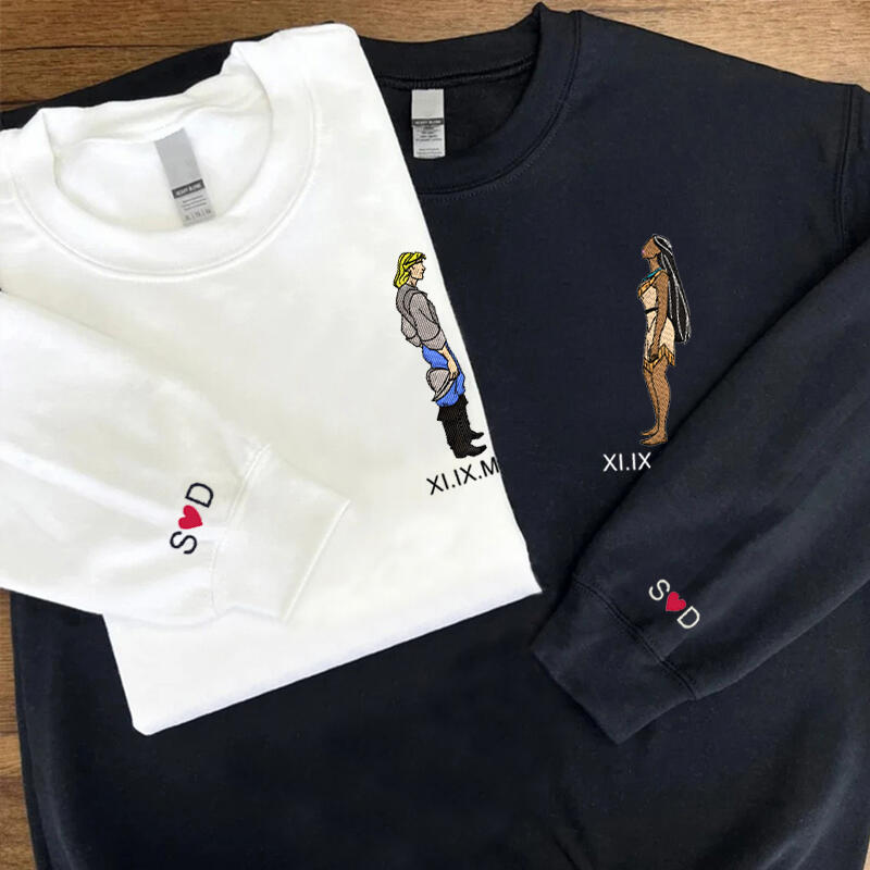 Personalized Sweatshirt Embroidered Cartoon Couple with Custom Roman Numeral Date Anniversary Gift for Lovers