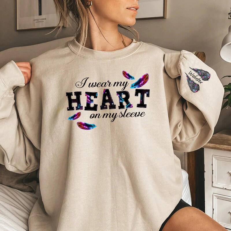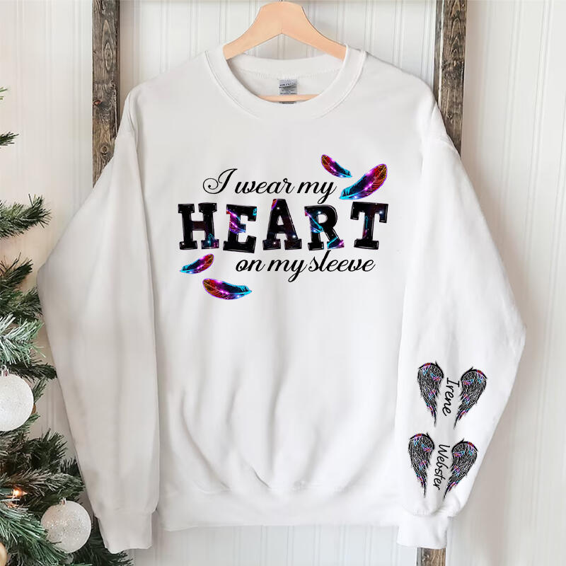 Personalized Sweatshirt I Wear My Heart On My Sleeve Glitter Feather Design Perfect Gift for Loved One