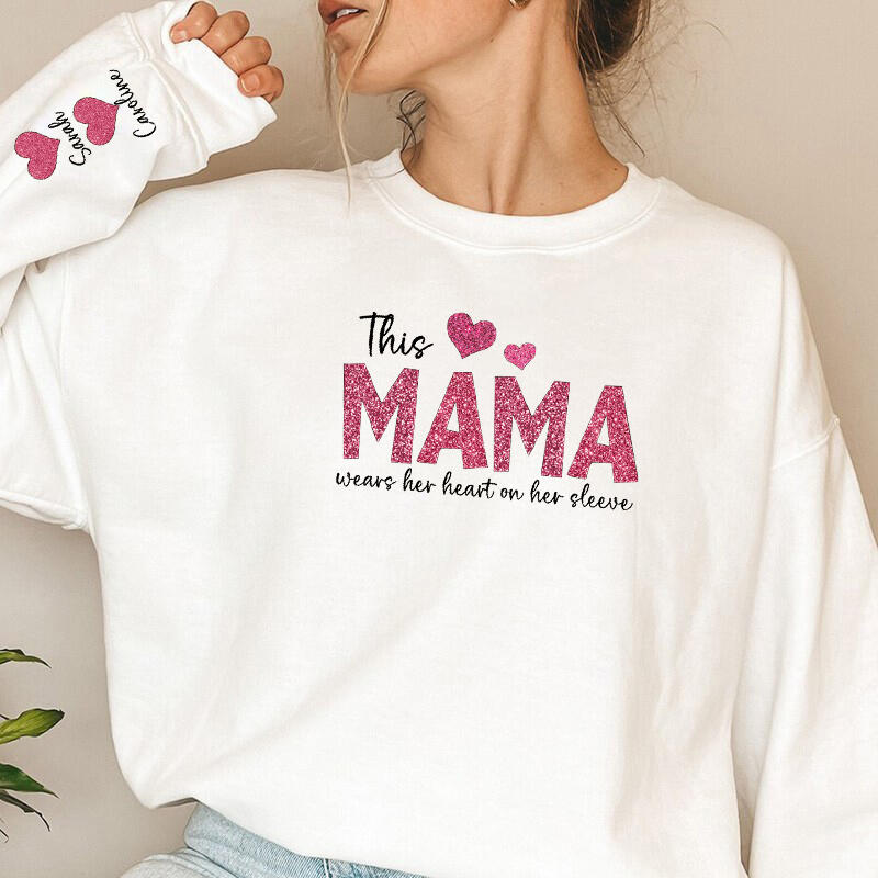 Personalized Sweatshirt This Mama Wears Her Heart On Her Sleeve Custom Glitter Design Exquisite Mother's Day Gift