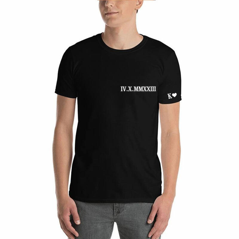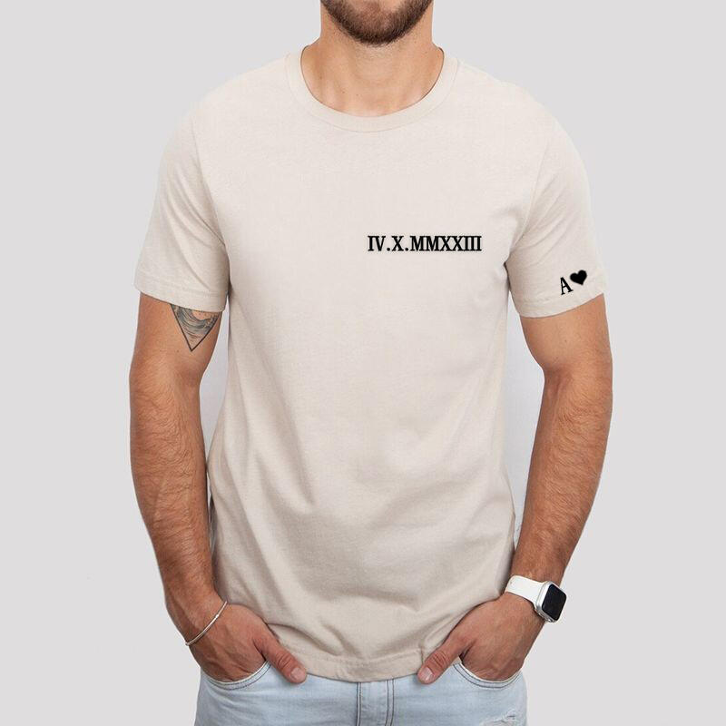 Personalized T-shirt Embroidered Lateral Roman Numeral Date and Initial Great Gift for Anniversary