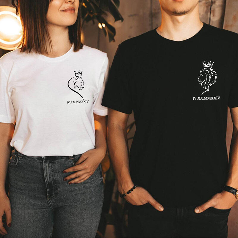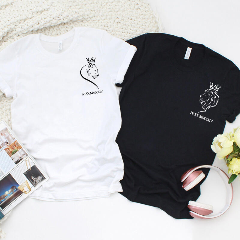 Personalized T-shirt Lion King Couple Crown Design with Custom Roman Numeral Date Gift for Lovers