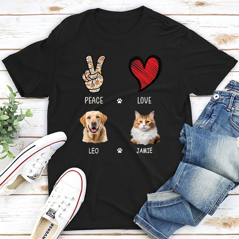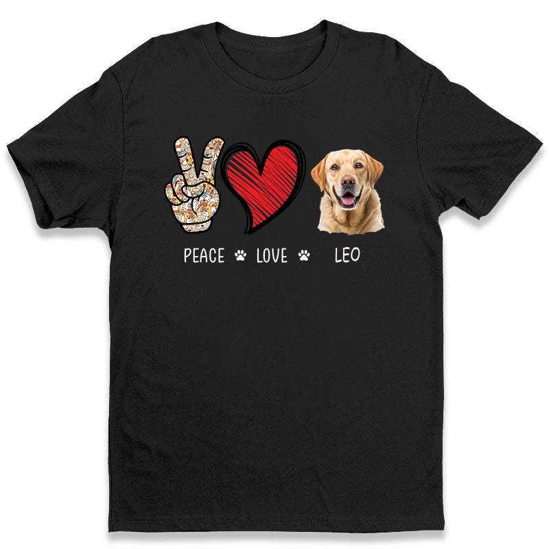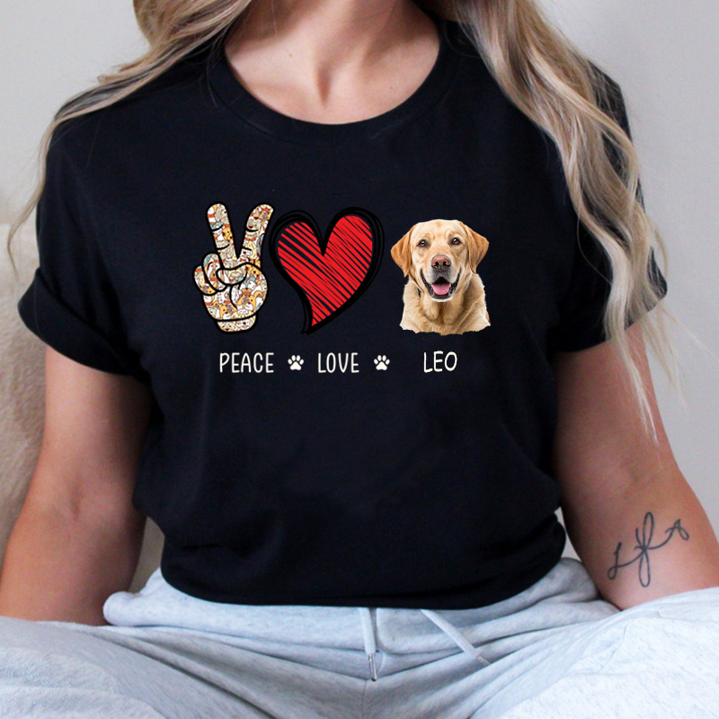 Personalized T-shirt Peace and Love with Custom Pet Photo Funny Design Great Gift for Pet Lovers