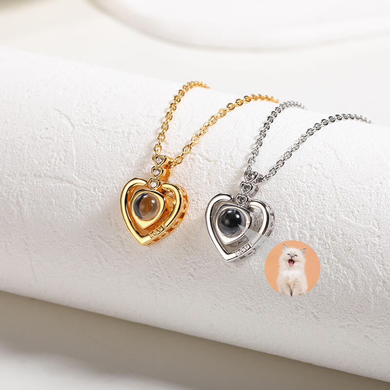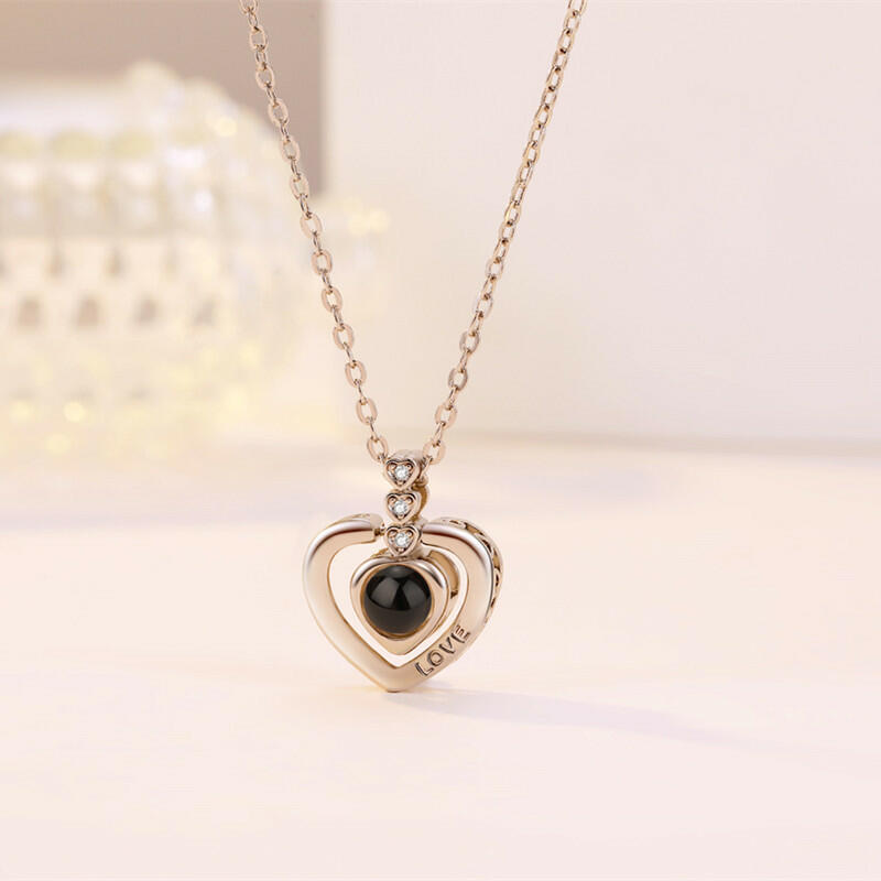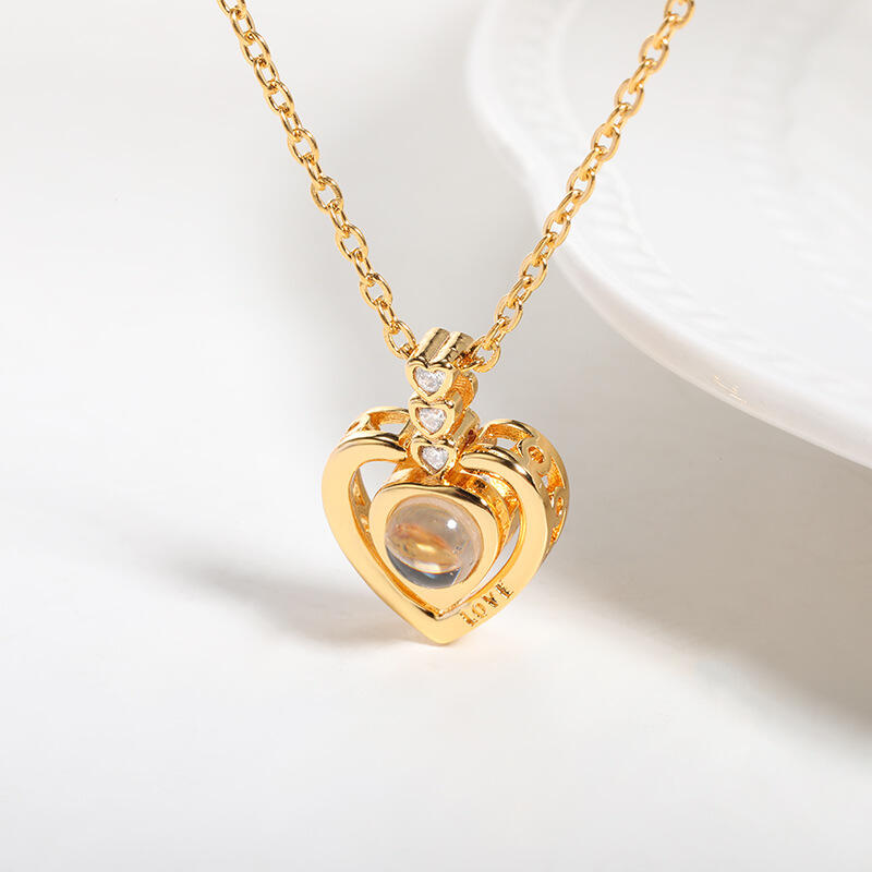 Personalized Three Hearts Photo Projection Necklace with Diamonds for Couple