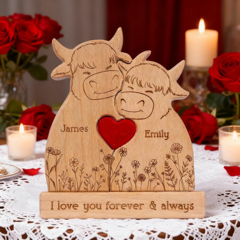Personalized Wooden Cow Figurines for Couples Sweet Gift