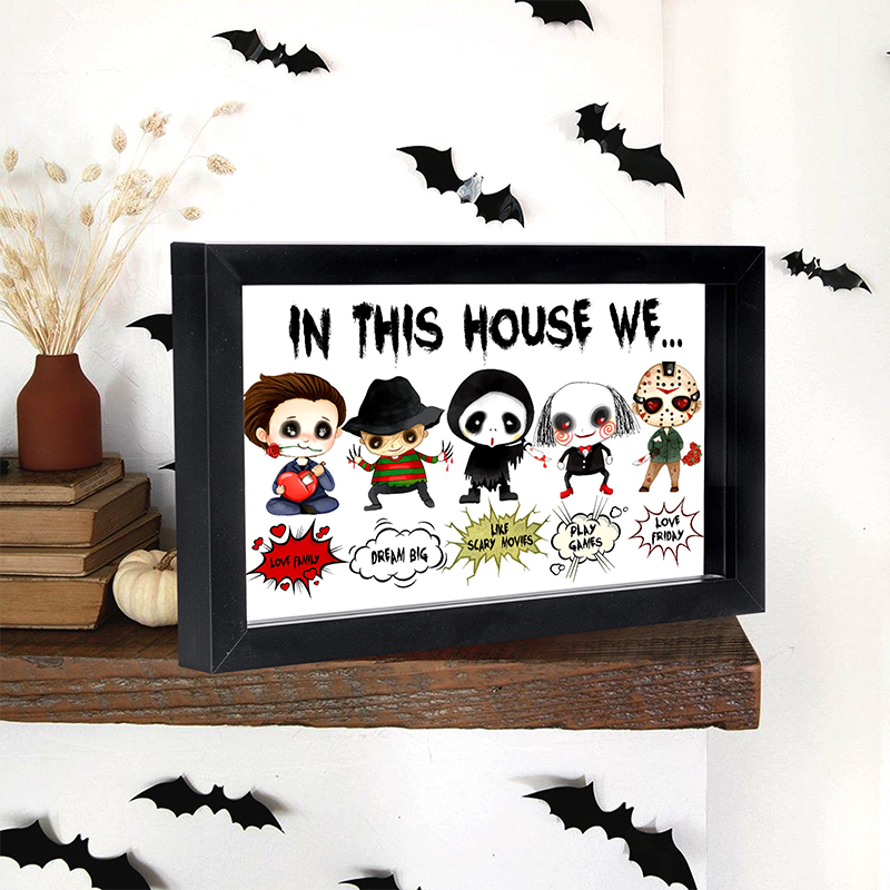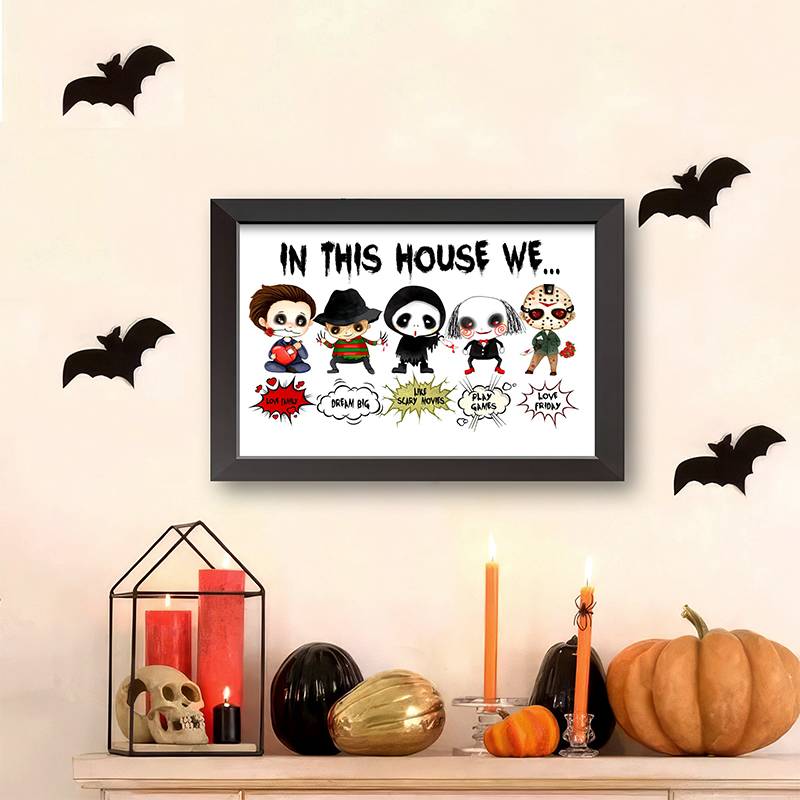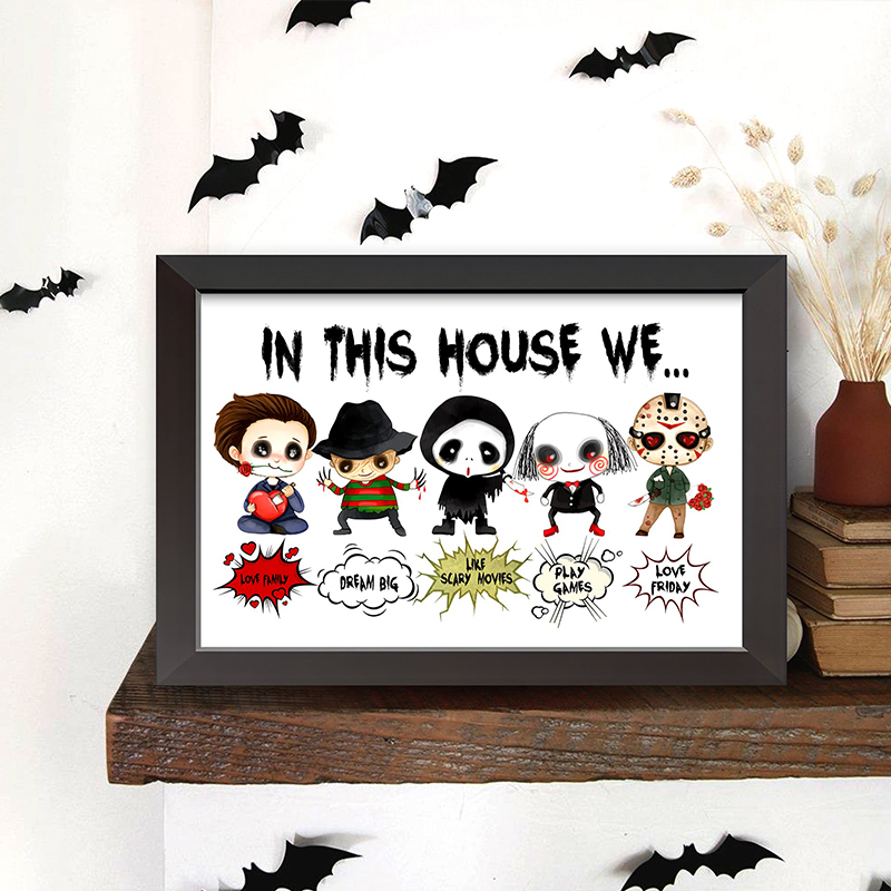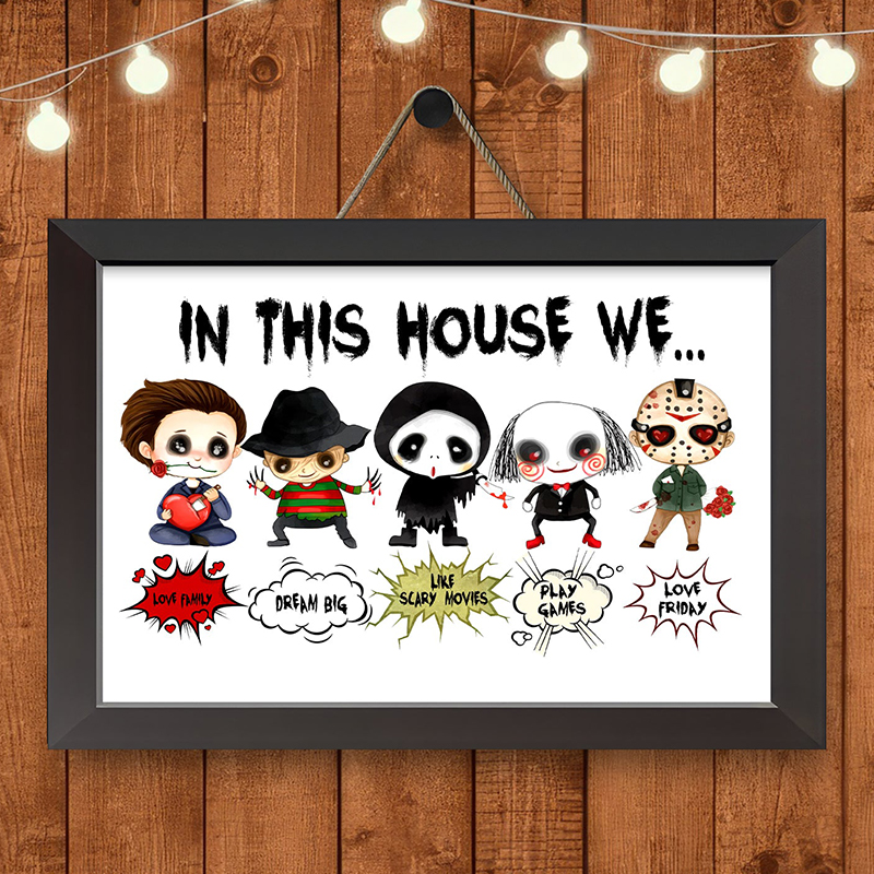 Our "In This House We..." series of custom wooden signs offer a wide variety of fun styles to choose from. Each product features an iconic horror movie character or cartoon horror costume image, perfect for fans of classic horror movies or Halloween horror themed home decoration. It is a unique and fun way to show your love for iconic characters while highlighting the values and activities that your family cherishes. Its detailed design and personalized elements make it a striking piece that reflects your passion and uniqueness. It will be a great gift for family or friends on Halloween, adding a touch of horror and fun to your home!