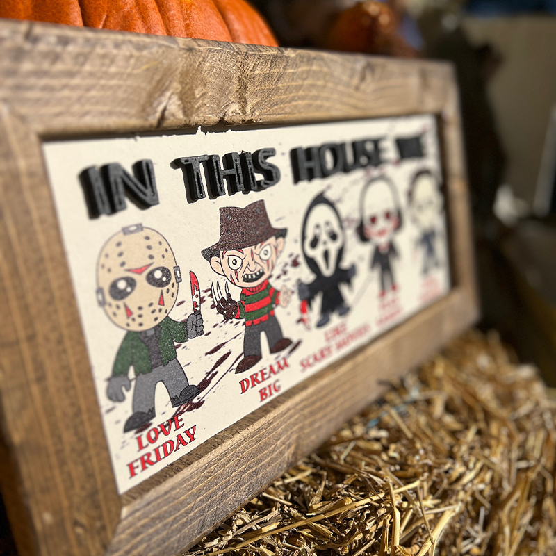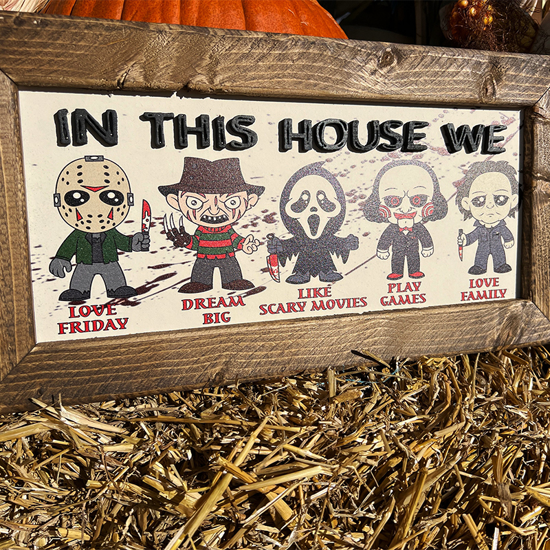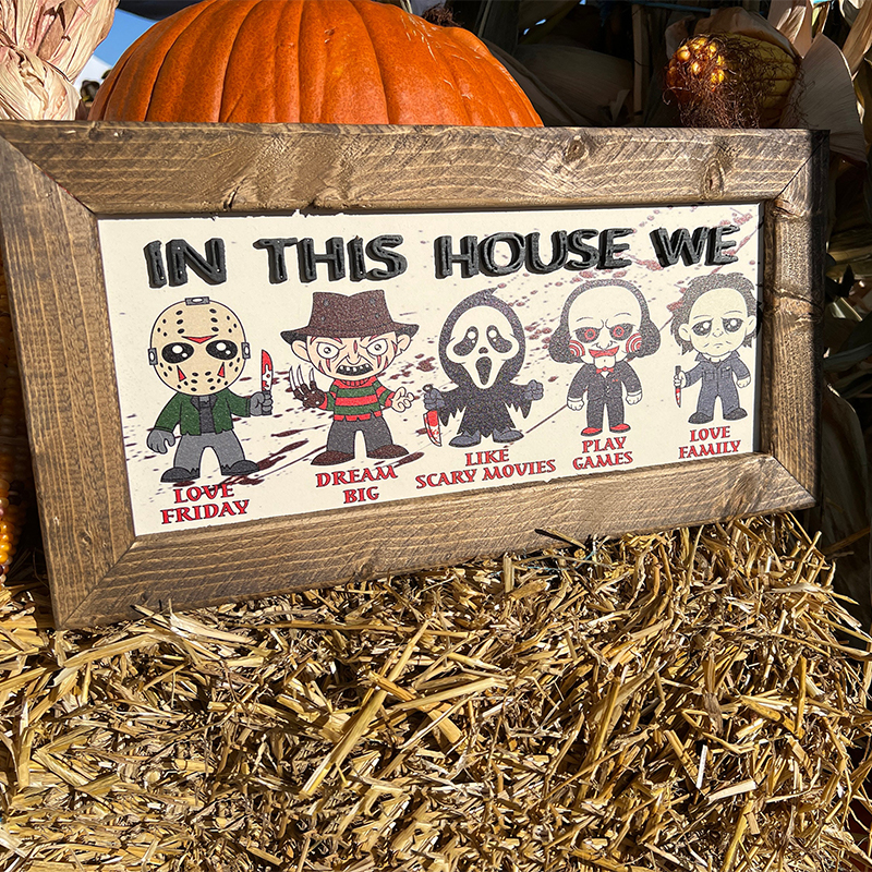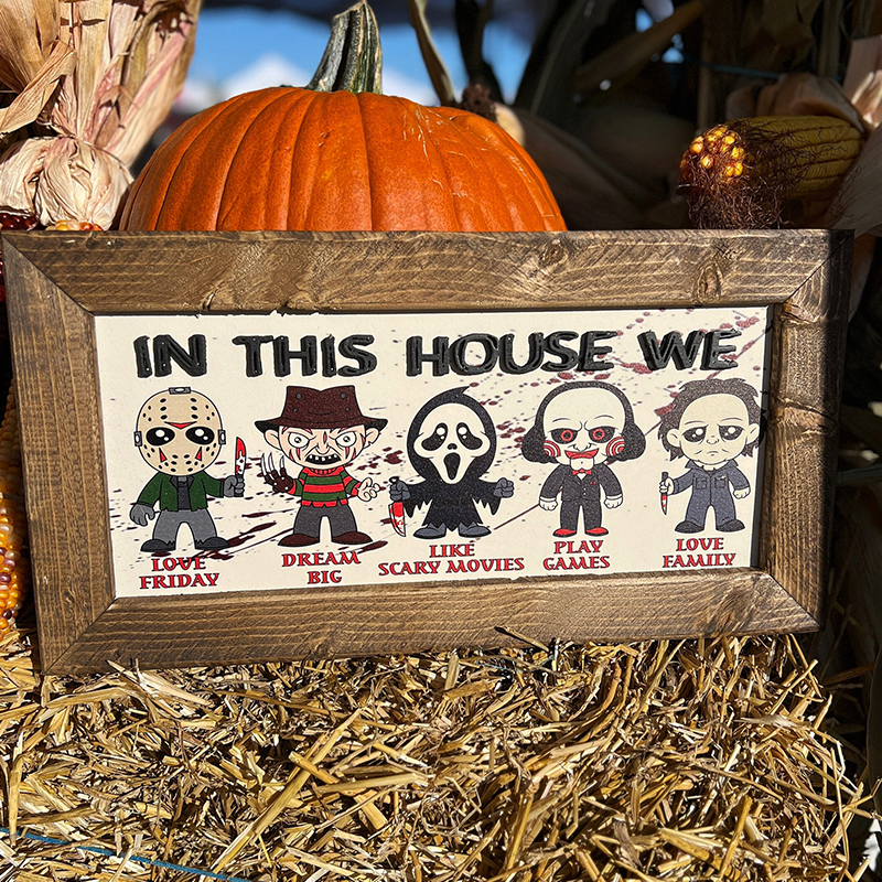 Our "In This House We..." series of custom wooden signs offer a wide variety of fun styles to choose from. Each product features an iconic horror movie character or cartoon horror costume image, perfect for fans of classic horror movies or Halloween horror themed home decoration. It is a unique and fun way to show your love for iconic characters while highlighting the values and activities that your family cherishes. Its detailed design and personalized elements make it a striking piece that reflects your passion and uniqueness. It will be a great gift for family or friends on Halloween, adding a touch of horror and fun to your home!