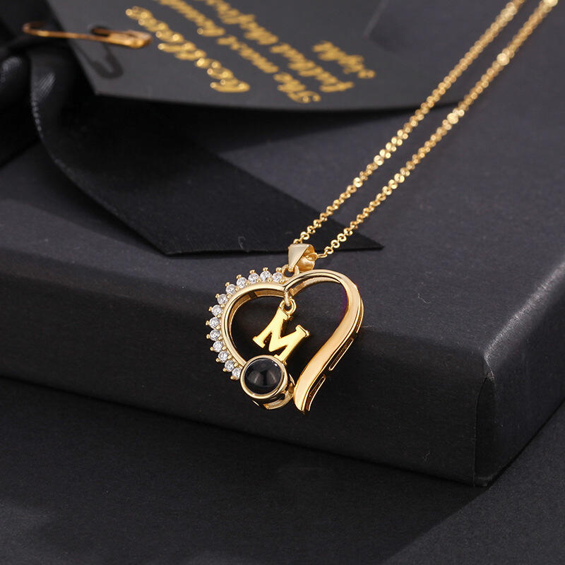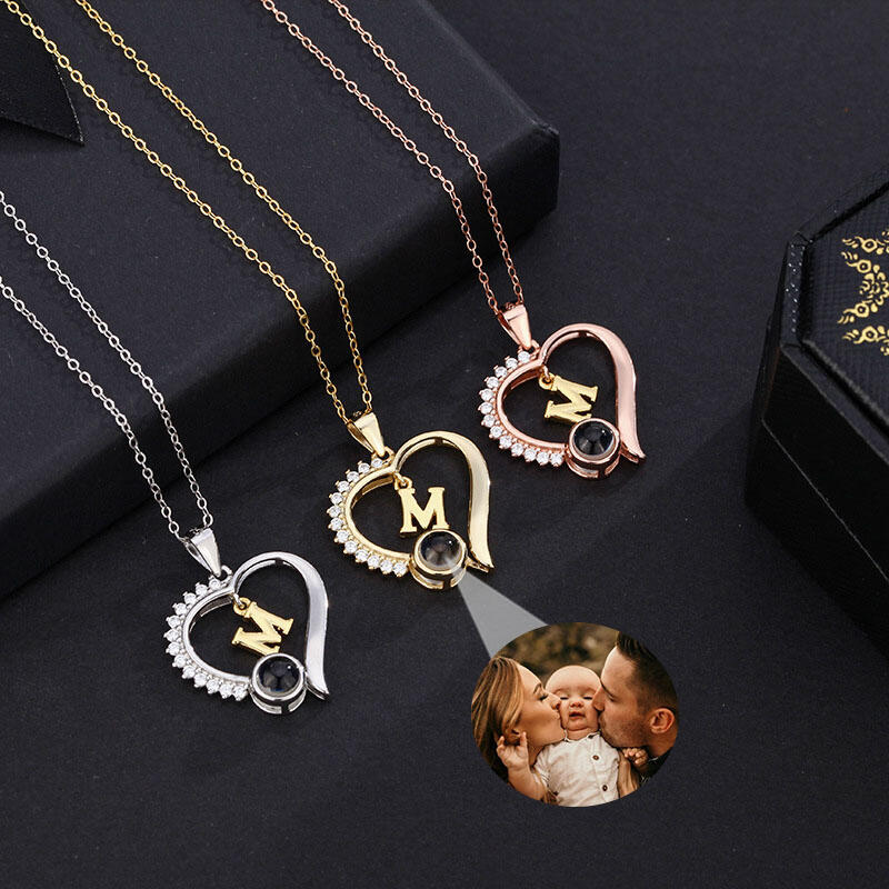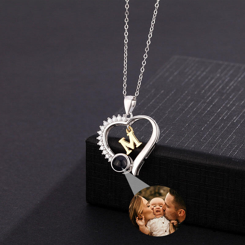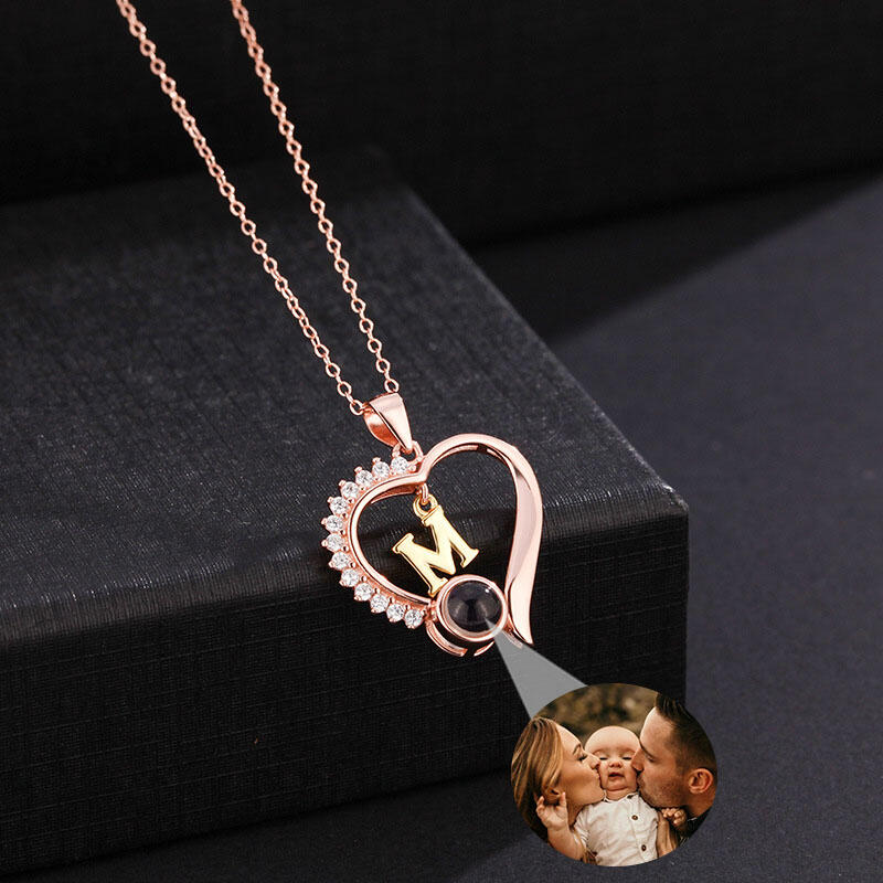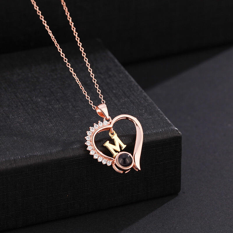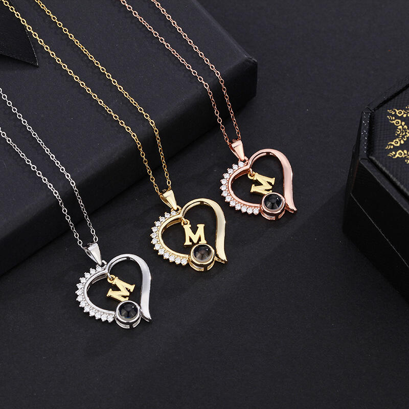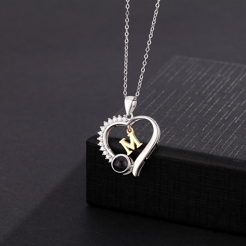 Sterling Silver Personalized Beating Heart Letter Projection Necklace with Diamonds