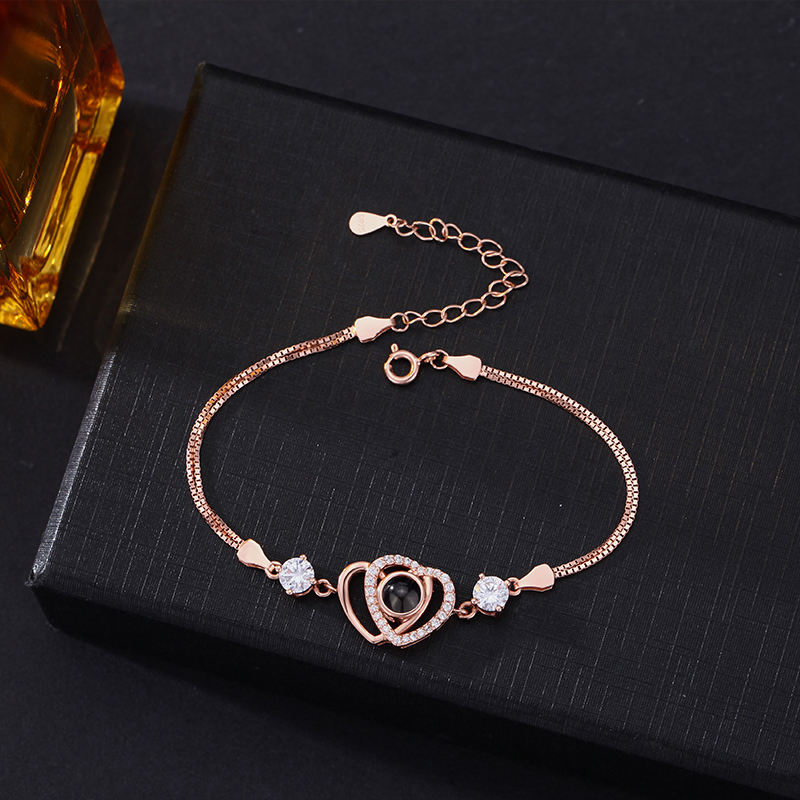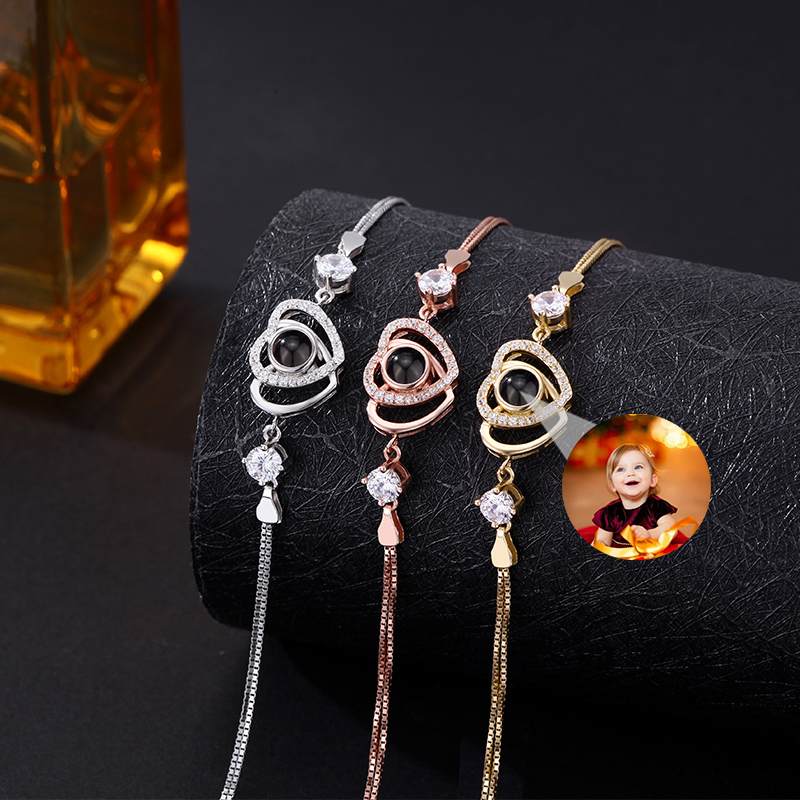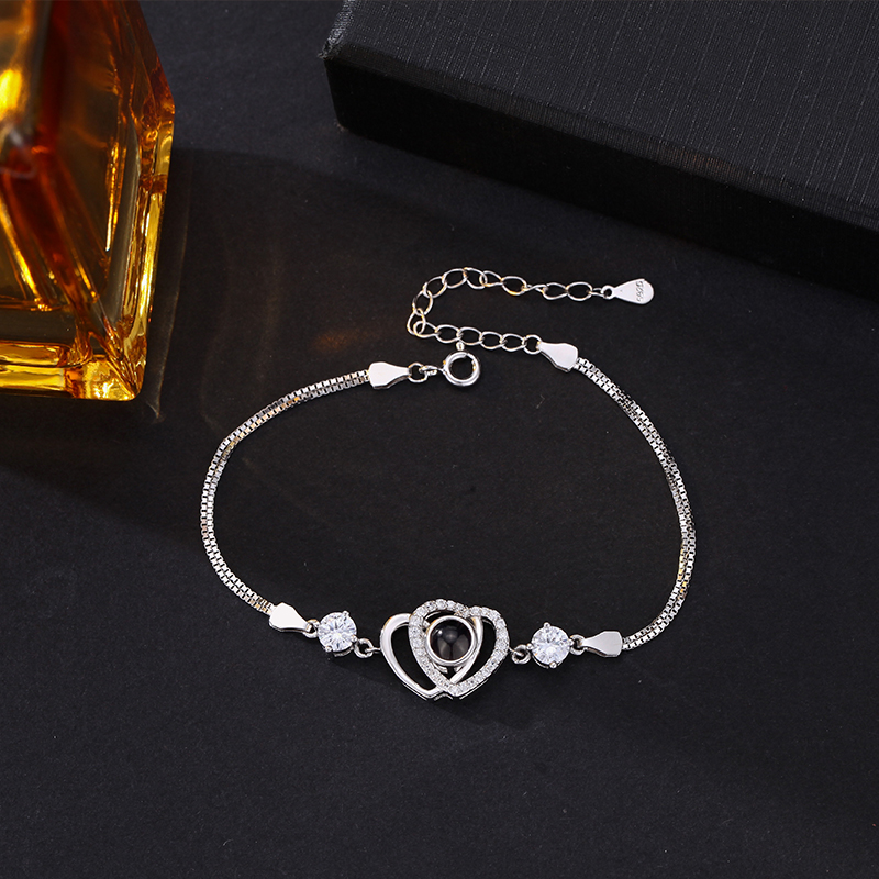 Sterling Silver Personalized Double Heart Photo Projection Bracelet with Diamonds for Her