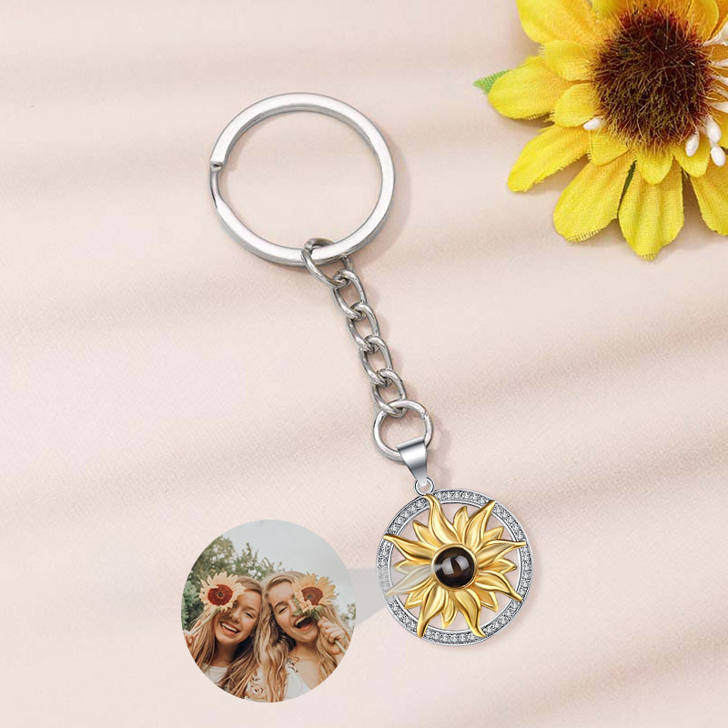 Sterling Silver Personalized Sun Photo Projection Keychain with Diamonds